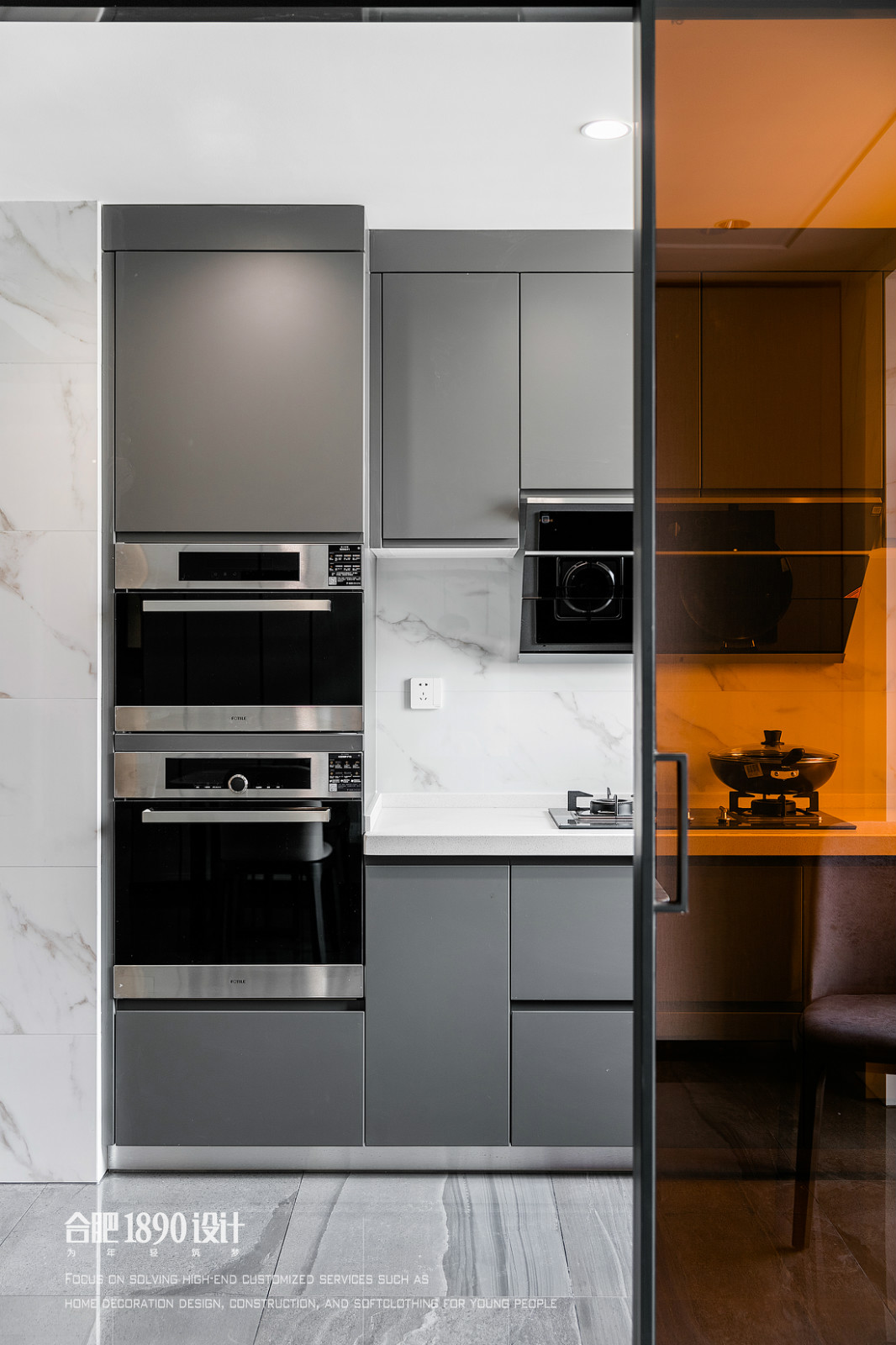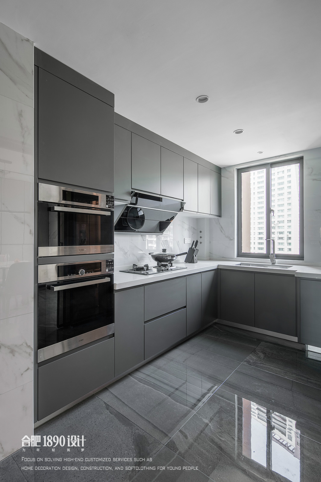 厨房橱柜采用高级灰色柜体与白色石材台面,搭配时尚的灰色地砖与爵士白瓷砖,相互呼应,相得益彰。