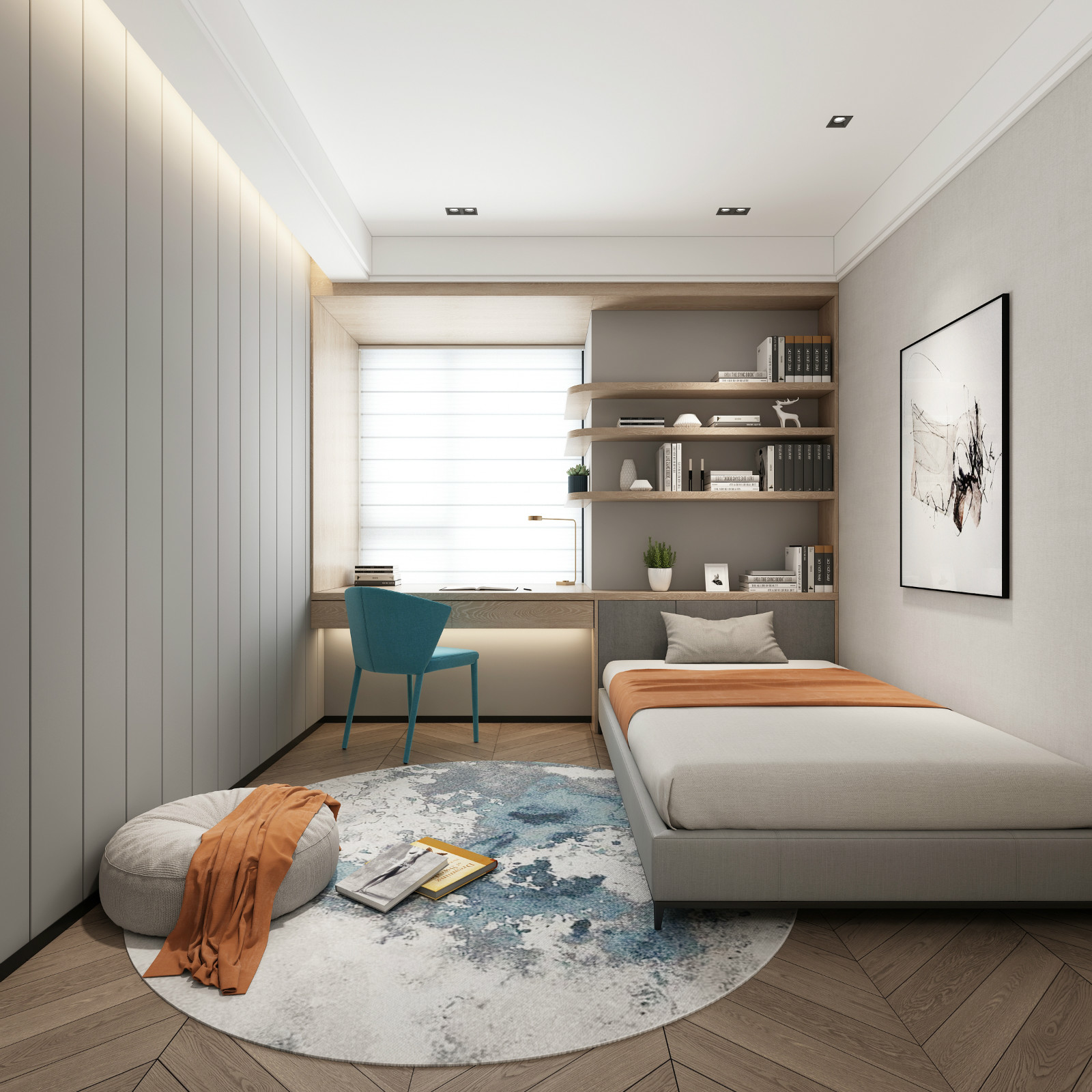 利用拐角的结构,做了一组写字桌和书架收纳展示,整体色系提升了两个度,让孩子房子相对明亮,且不失整体空间格调品质。