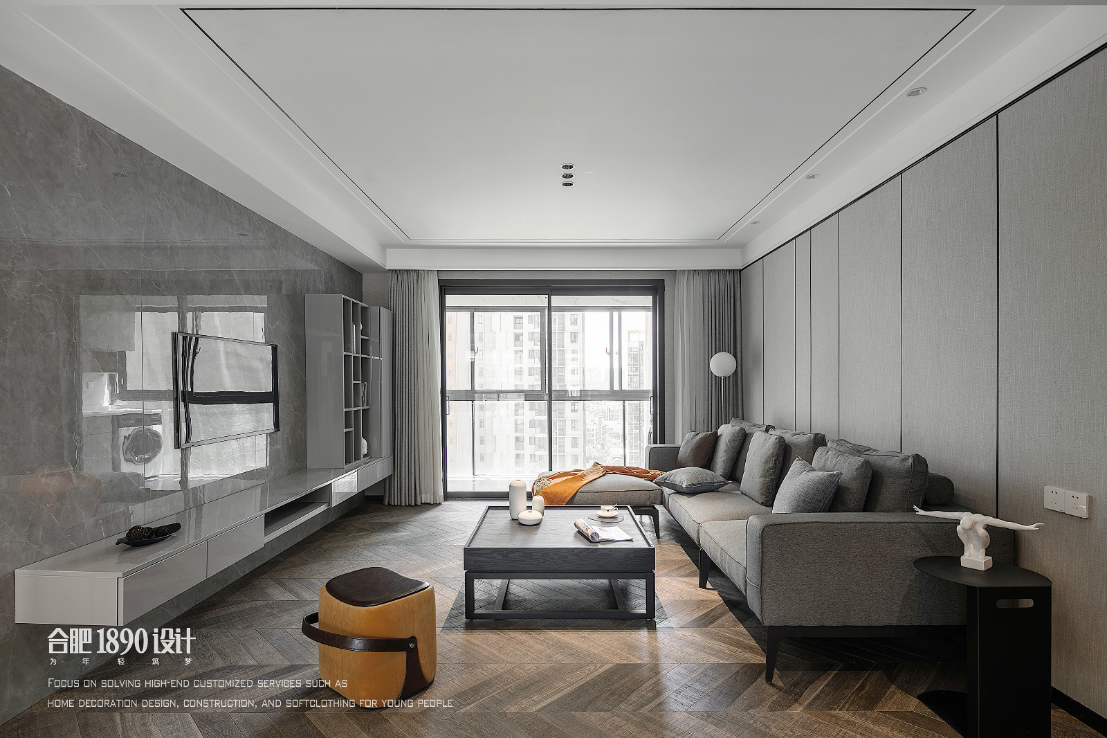 无主灯化的设计,让客厅空间简约时尚,电视背景组合柜,满足了平时展示与收纳,烟熏色的鱼骨拼地板,拉升了客厅高级轻奢感。