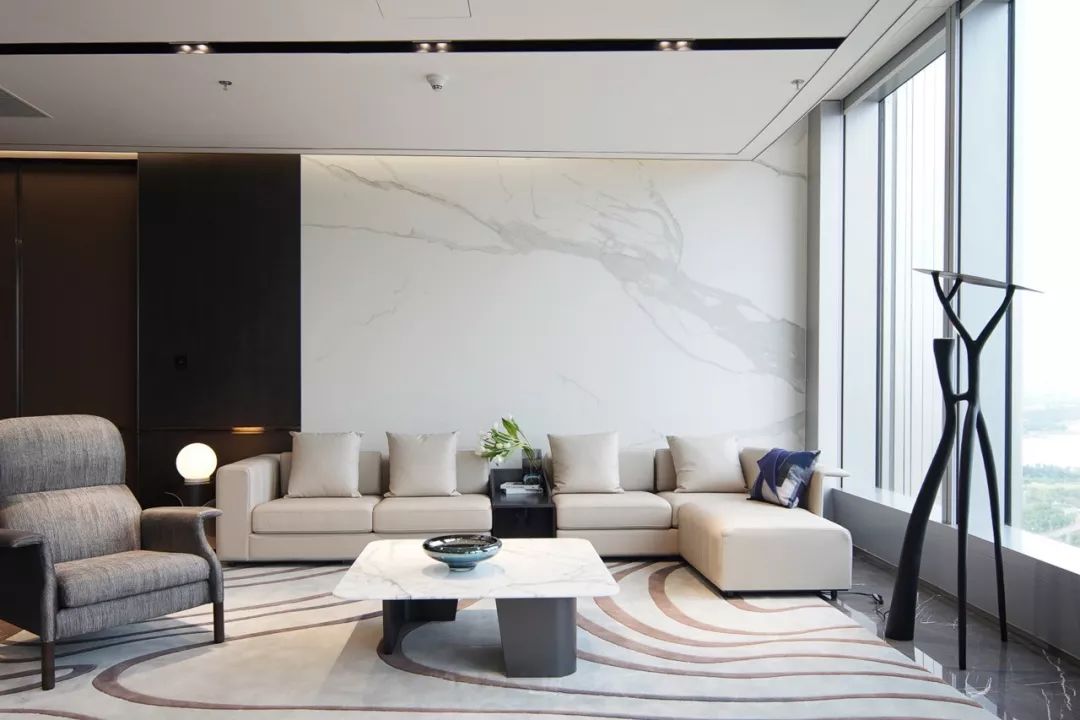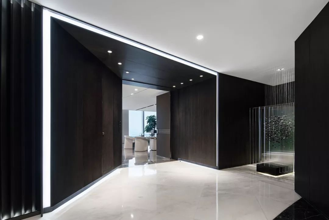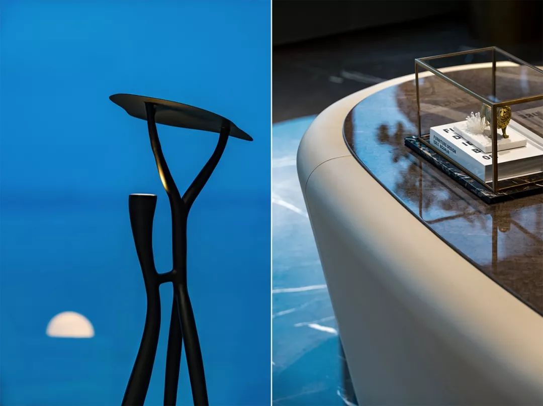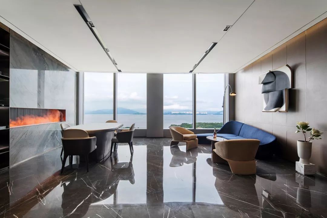 公共区域由独立的门厅过渡到vip商务室。通过面部识别后,两扇门缓缓开启--仪式感和科技感正是通过这样的场景传达给来访者。整排的落地窗外,映入眼帘的是一览无余的绝佳海景,带来在云之巅的尊贵体验。