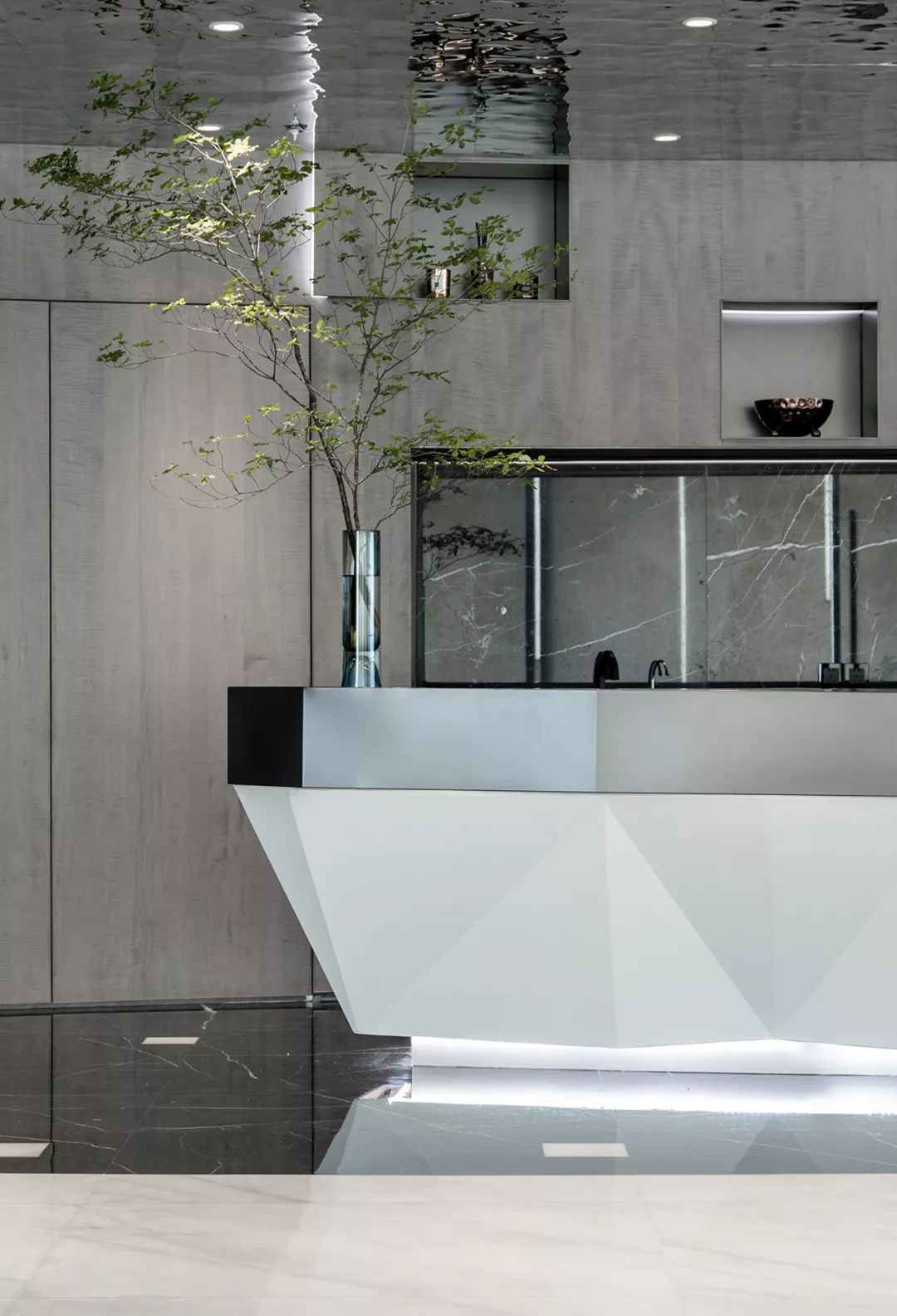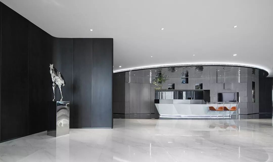 入口处的接待台将来者的视野引入整个空间。材质是空间的语言,背景的不锈钢竖条通过不同的角度排列形成似风拂过的琴键变化。“纳自然之形,建空间之意”。