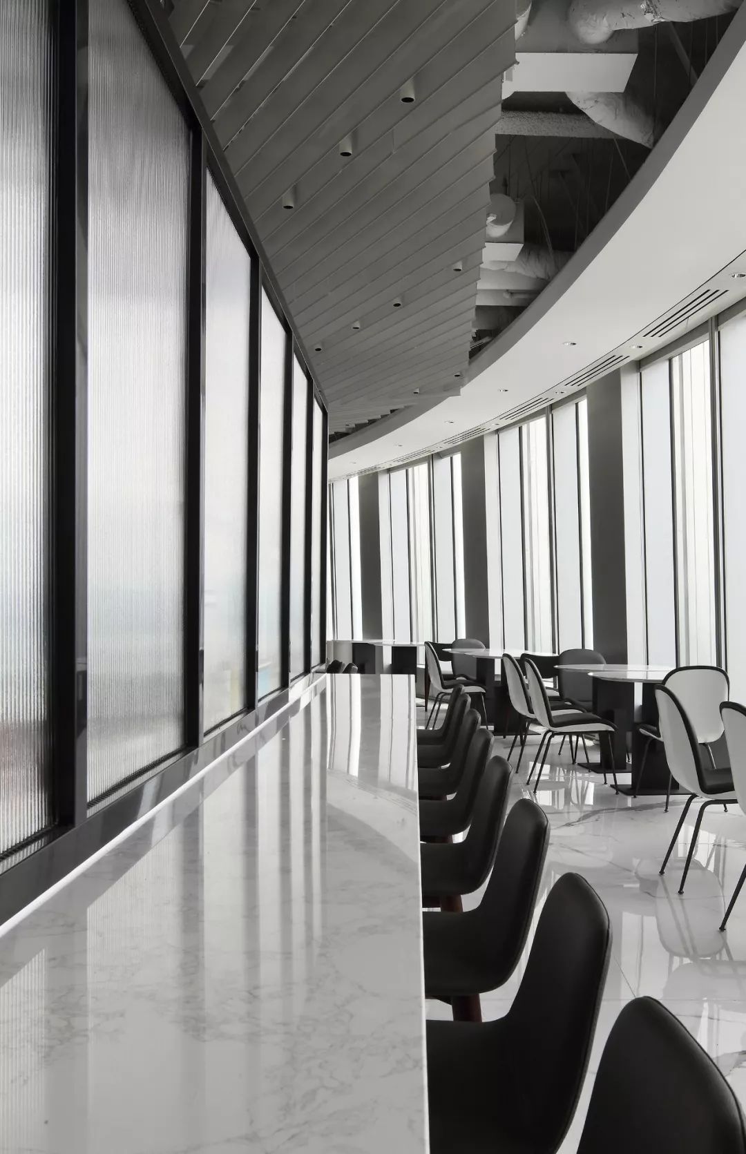 在离窗户较远的就餐区域采用“借景”手法,通过墙上镜面,将窗外的美景反射到室内,在任何一个角度都可以欣赏到高空美景。