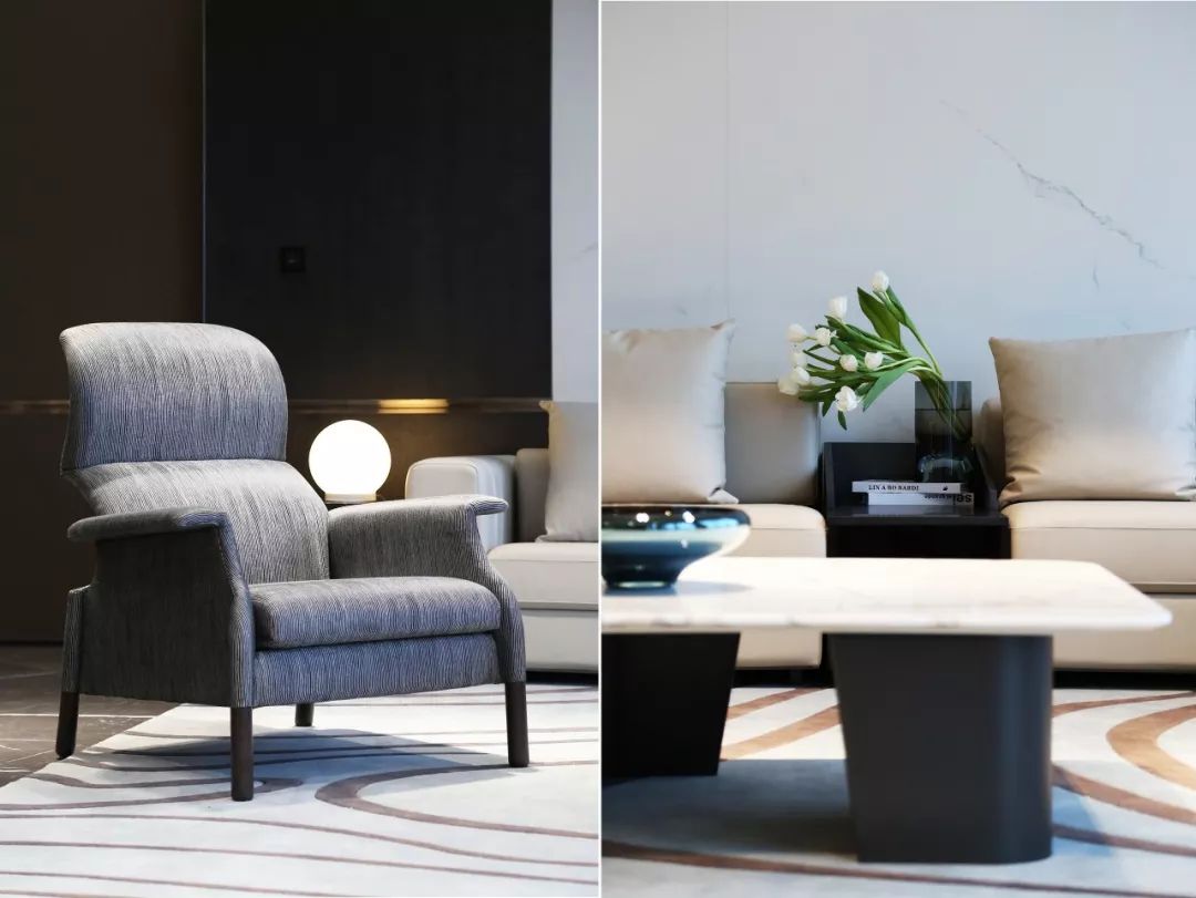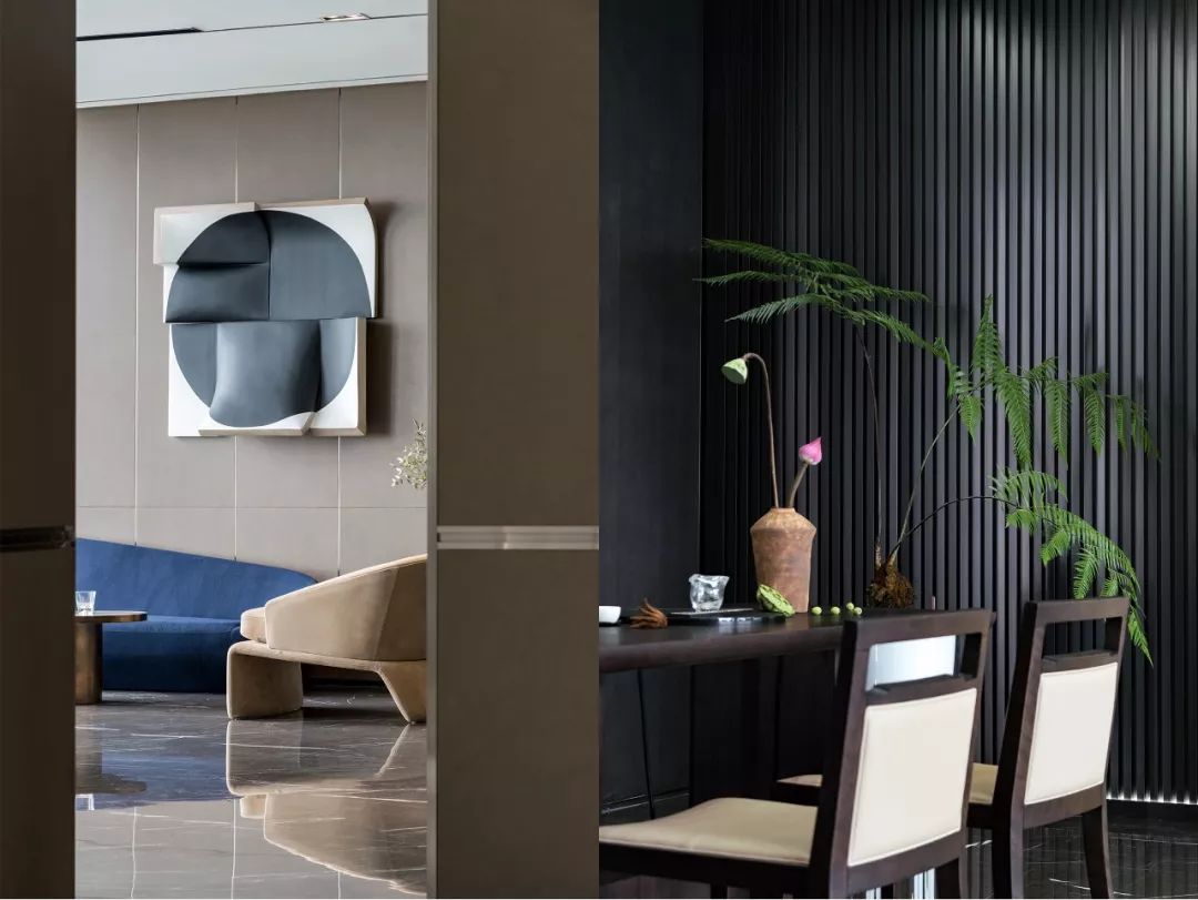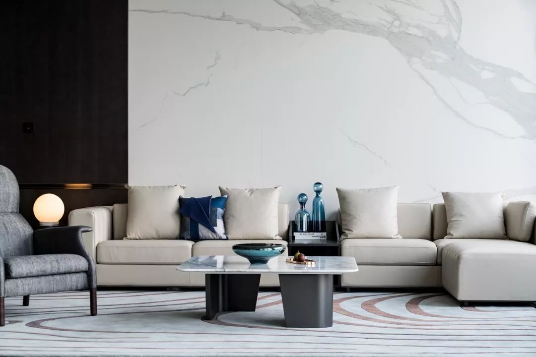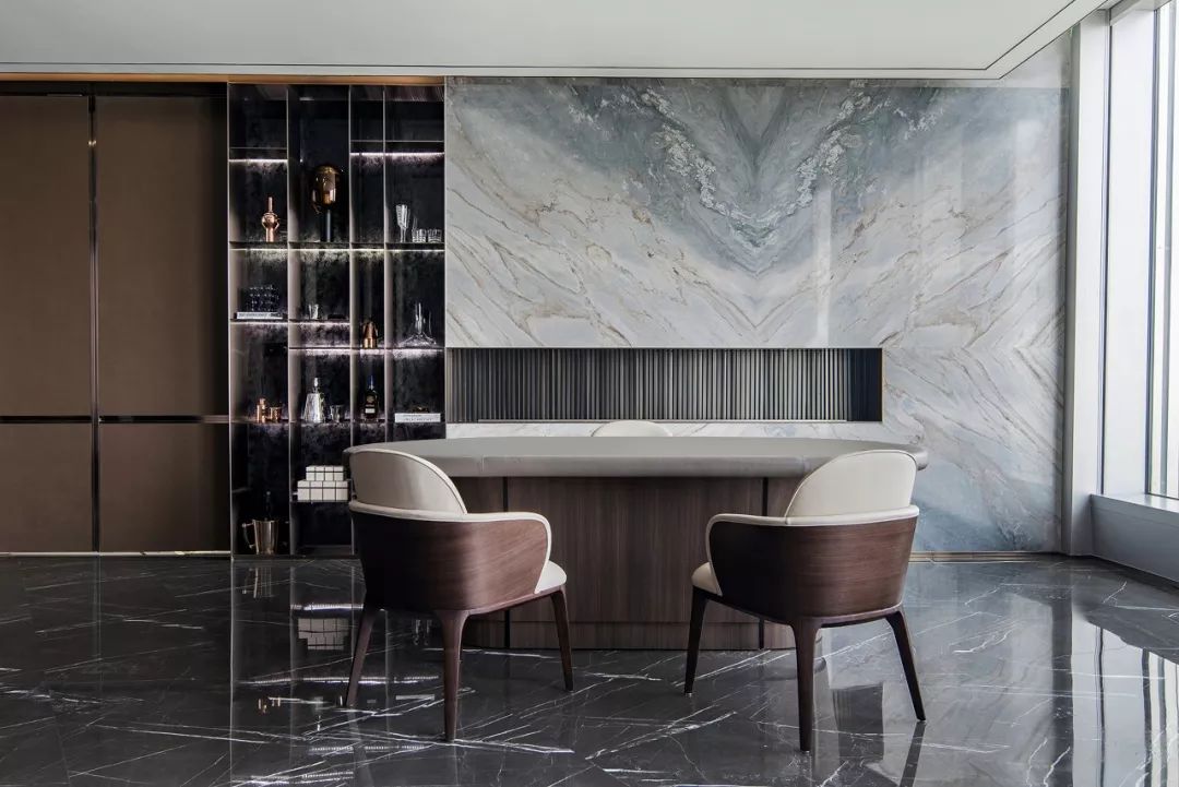 磨砂皮质地/羊毛呢/石材的材质凸显高贵品质,配合舒适和开阔的景色,旨在打造开怀畅饮相聚言欢的场景体验。