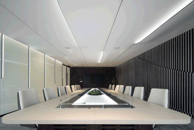 容纳16个人的会议室,背景以水波纹为元素,与天花板的曲线交相呼应,传达了思想交流和碰撞的过程。环保高效的无纸化办公系统体现出深圳的特质--效率、务实、国际化。会议室和独立办公室的隔断使用雾化玻璃,两者的独立和开放可以自由切换。
