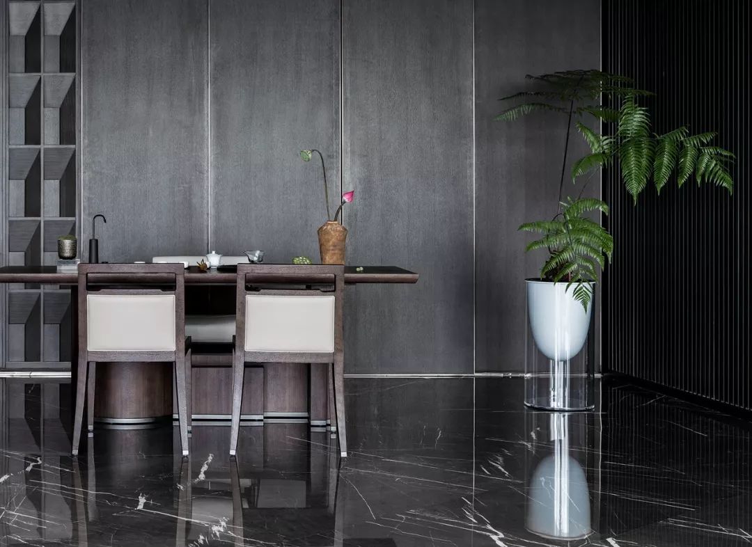 茶室的天花板与墙面模糊了边界,形成一个独立的空间体。石材上的茶桌倒影像平静的海面--平和悠然,以茶会友,诠释品赏茶的美感之道。