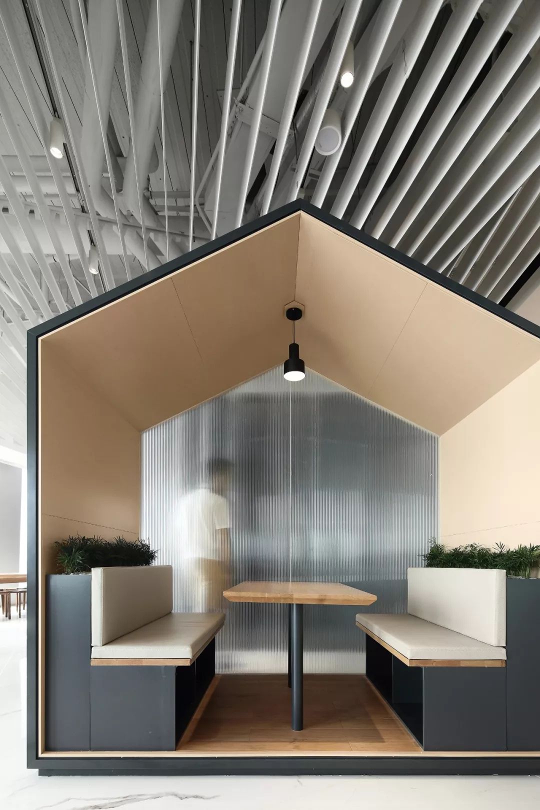 △灵感来自海风的餐位设计作为企业形象提升的重要一环,很多知名企业率先对员工餐厅进行改革,积极吸收社会餐饮经验,引进商业化的服务与竞争模式,并从设计到施工全都委托给专业团队。员工餐厅也完成从“食堂”到“美食广场”再到“企业餐厅”的蜕变。