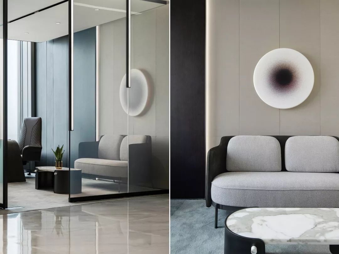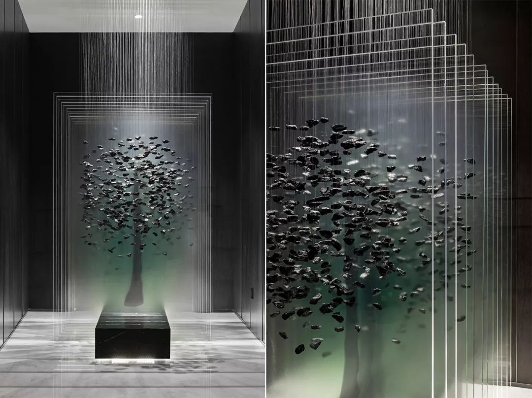 艺术是空间的底色,艺术作品应当具有人文关怀和文化启蒙。设计师根据行业属性及企业文化创作的雕塑作品“源”,通过一层层的亚克力、形似煤炭的石子,叠加构成树的姿态,形成虚实的变化,也成为吸引人驻留的一隅清净处。