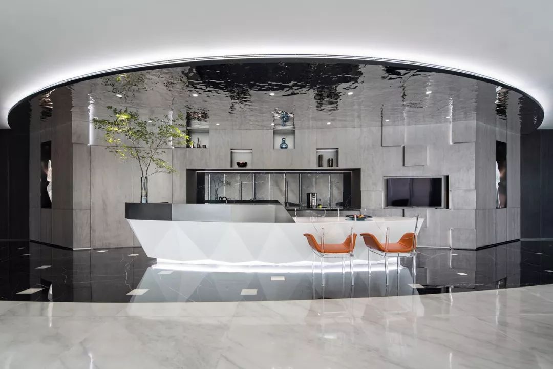 水吧台的顶面、地面、墙面划出一个独立区域块,切面的造型则呼应大厦的建筑结构,使得硬装与建筑相融,软装自硬装中生长。