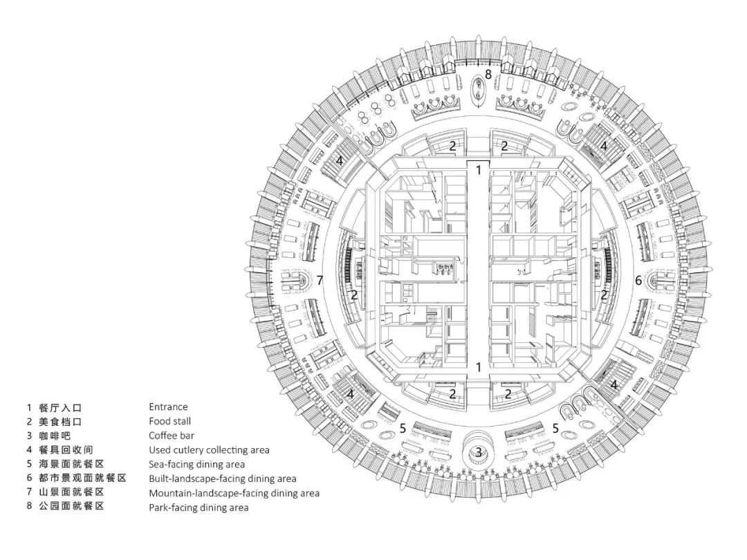 将场地的景观优势最大化整个餐厅空间为无柱化设计,圆形的平面提供了360°的观景视野,可以在200米的高空远眺海、湖、公园和高尔夫球场等多重复合景观。