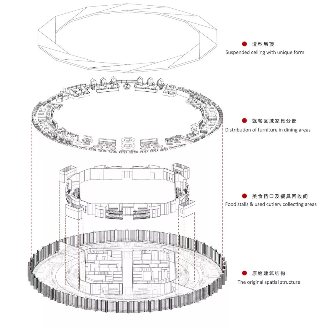 设计师结合场地特点,设计之初做了大量的就餐动线推演,最终确定了以一条4.5米宽内环线为主动线的规划方案,沿环线内侧分布餐线和档口,外侧分布就餐区,且对环线进行强制性分隔,使排队取餐人群同用餐人群互不干扰。