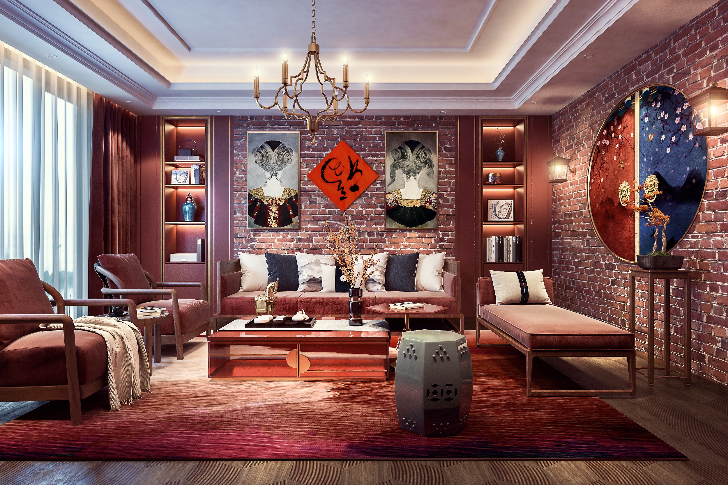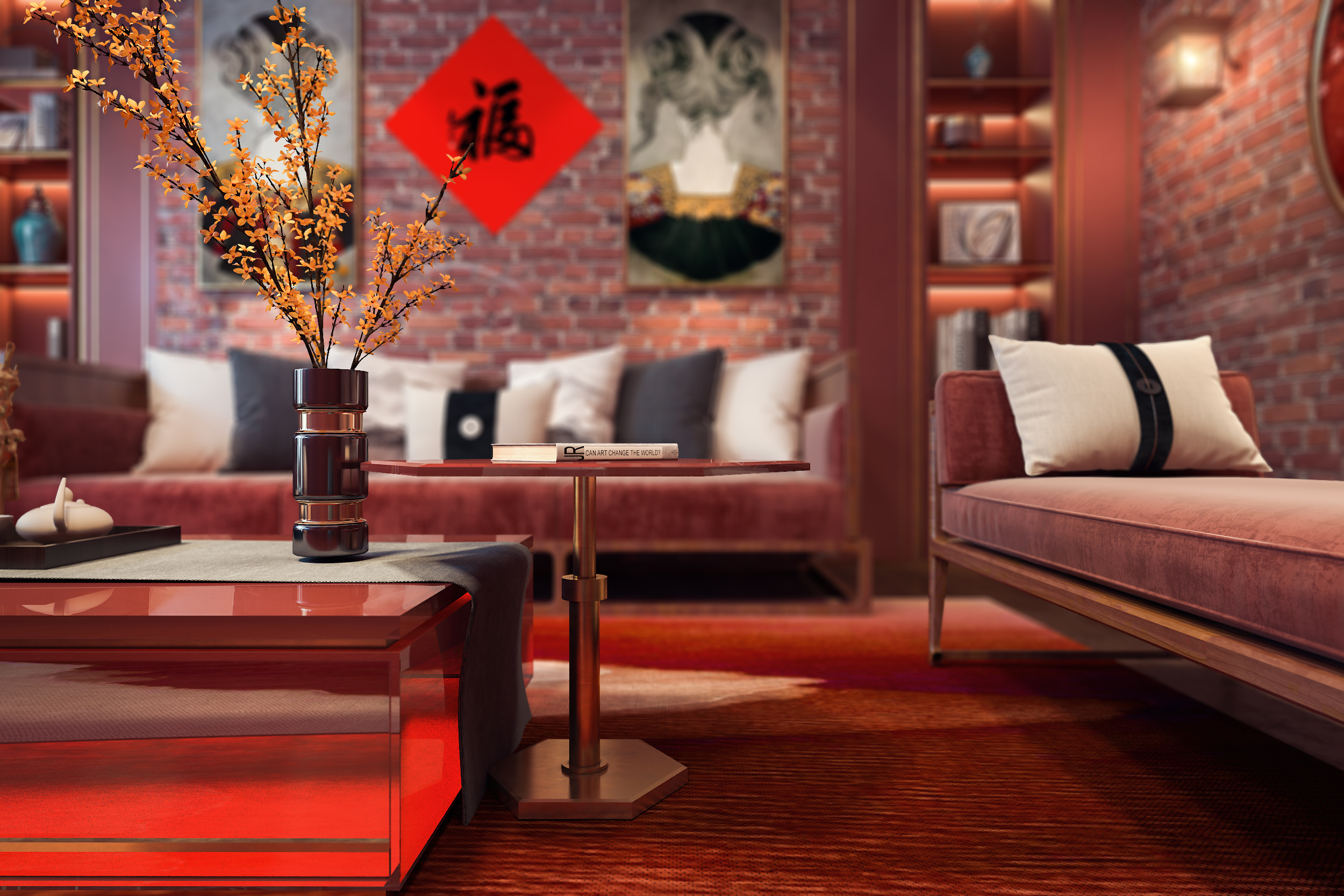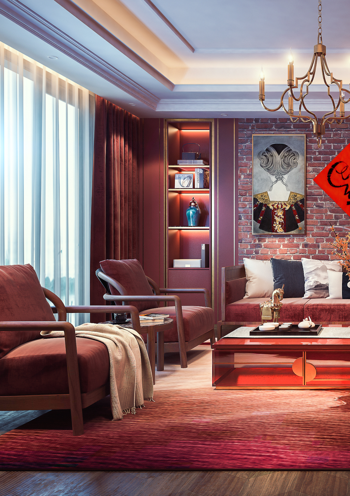 红色砖墙的墙面设计确实很有复古的一面,只是天花没有改造一下,导致场景有点出戏,而且砖墙的材质没有凹凸,地毯的材质也有点变形这个需要注意,暗红色布艺沙发与红砖墙的搭配也算和谐,这个比较好的,只是墙面的挂画不融洽。