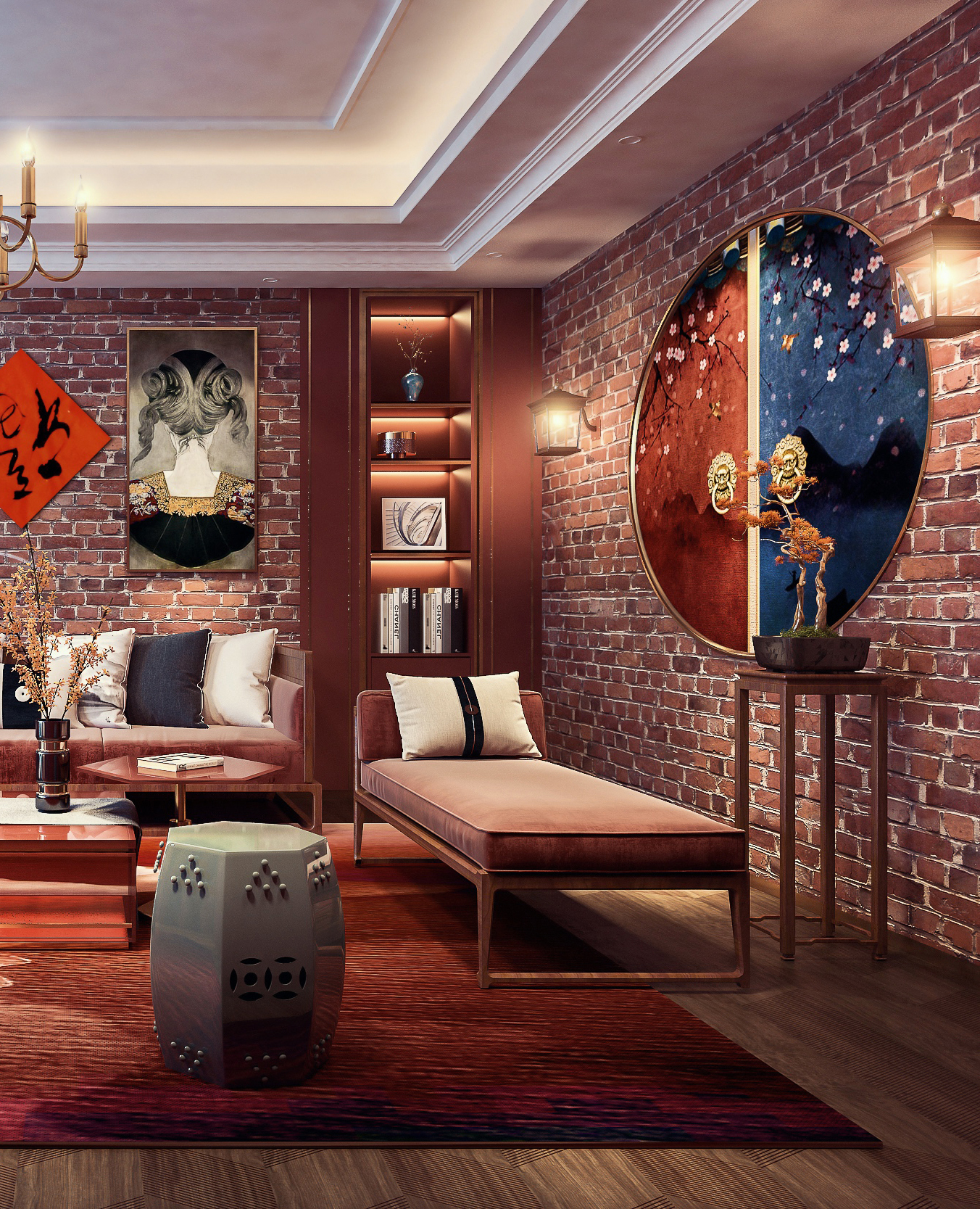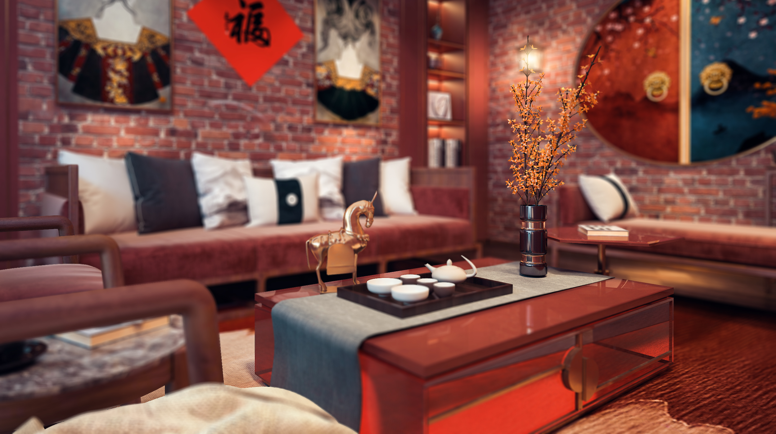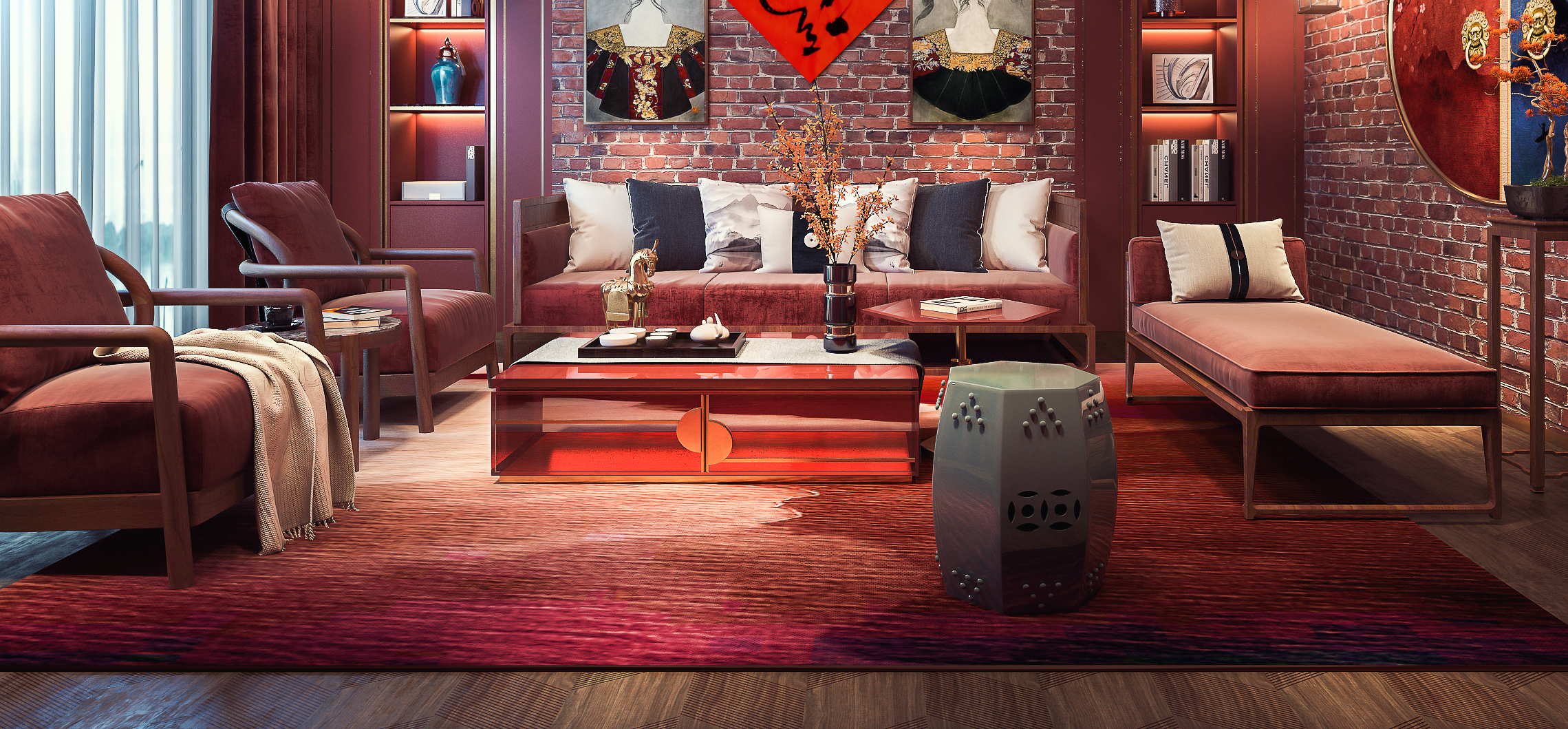 红色砖墙的墙面设计确实很有复古的一面,只是天花没有改造一下,导致场景有点出戏,而且砖墙的材质没有凹凸,地毯的材质也有点变形这个需要注意,暗红色布艺沙发与红砖墙的搭配也算和谐,这个比较好的,只是墙面的挂画不融洽。