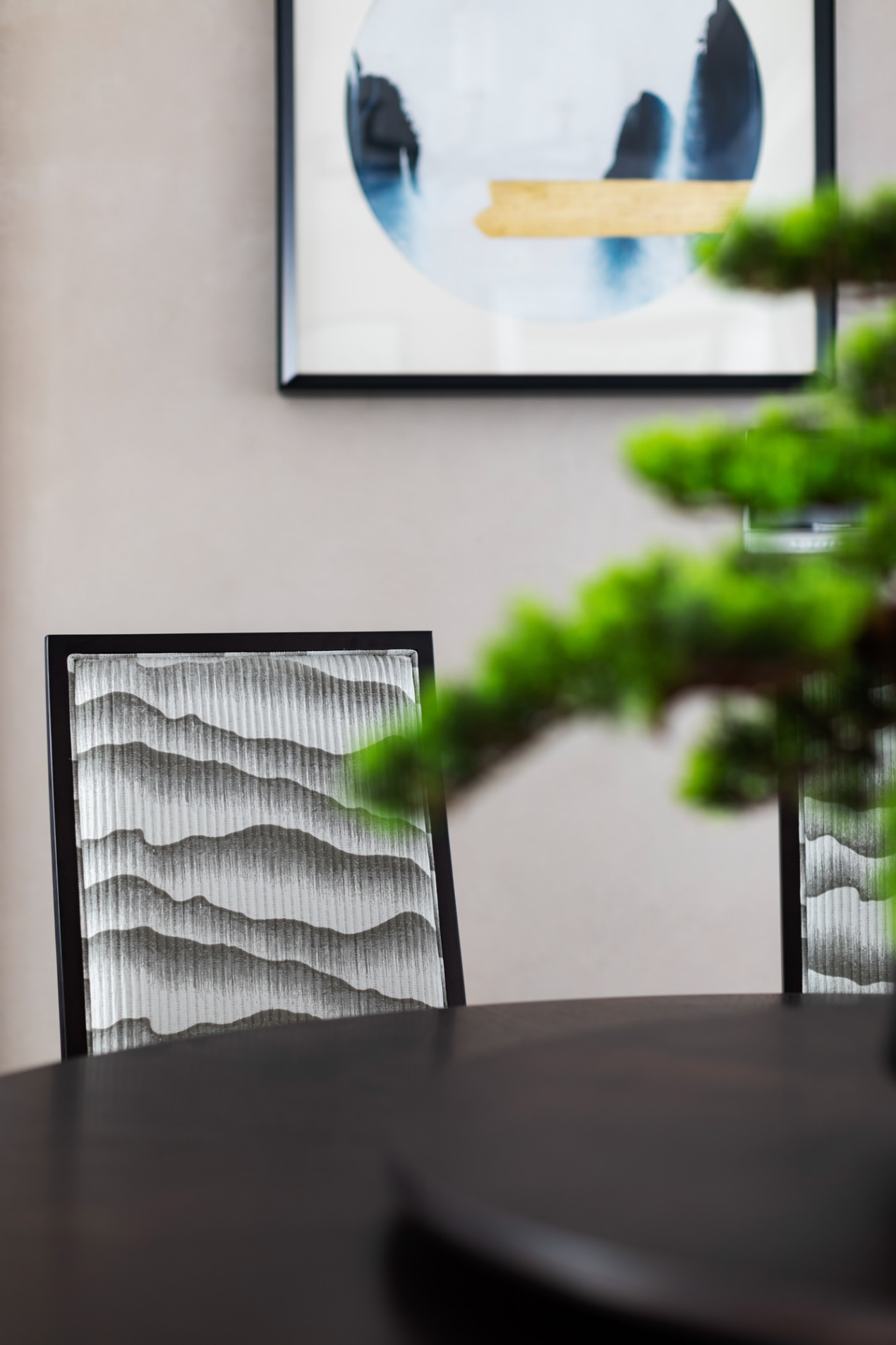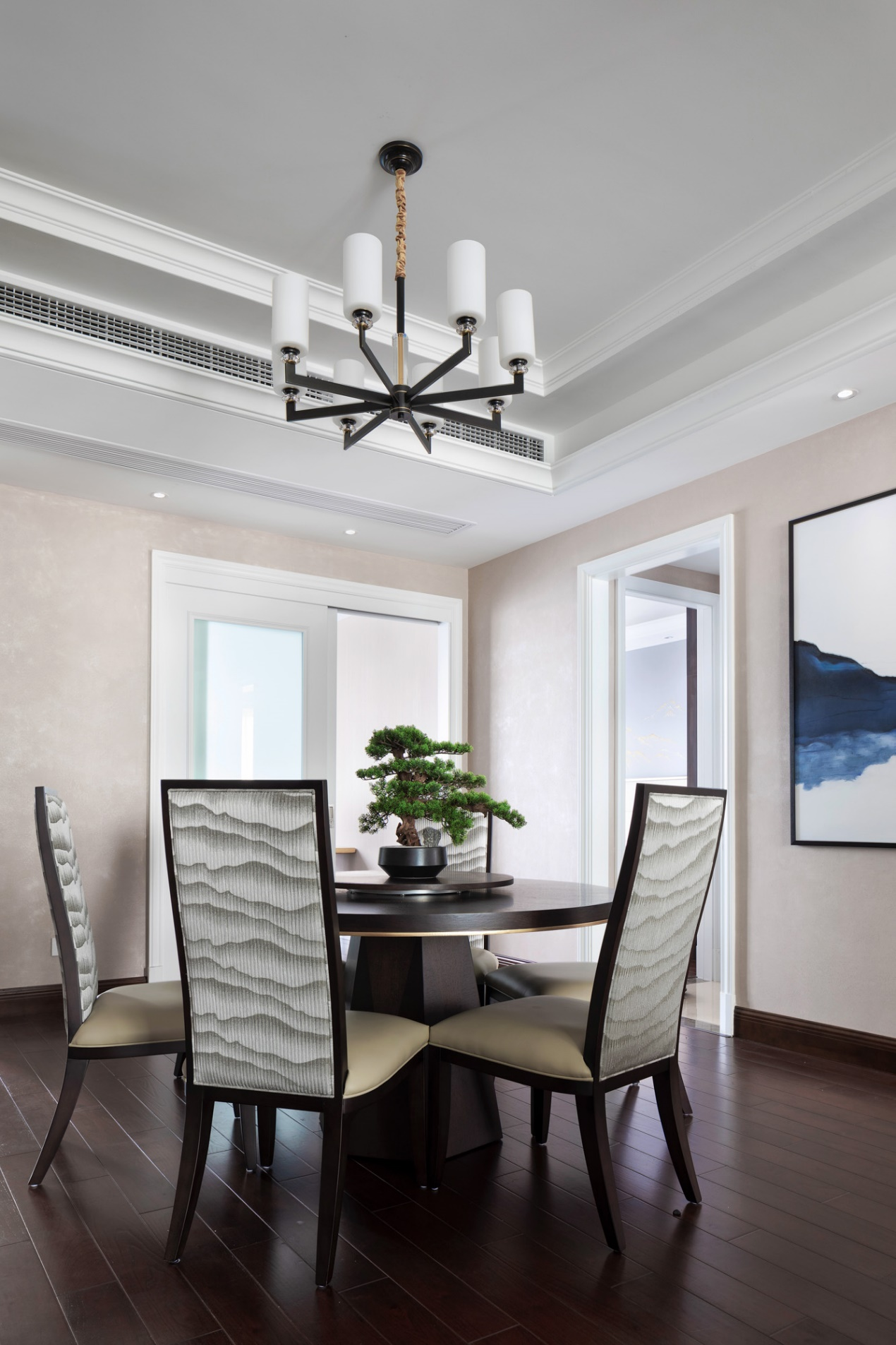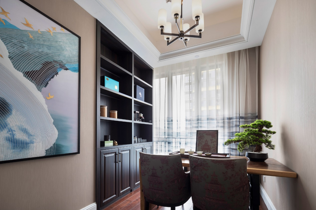 餐厅给人淡雅素静之感,椅背的花纹似山似水,韵在山水写意间,遐想意趣,享受诗画之美。「月落乌啼霜满天,江枫渔火对愁眠」鱼鸟山水的装置画包含东方意境,将空间氛围映衬得柔和淡雅。一张餐桌,几把座椅,品质生活一览无遗。