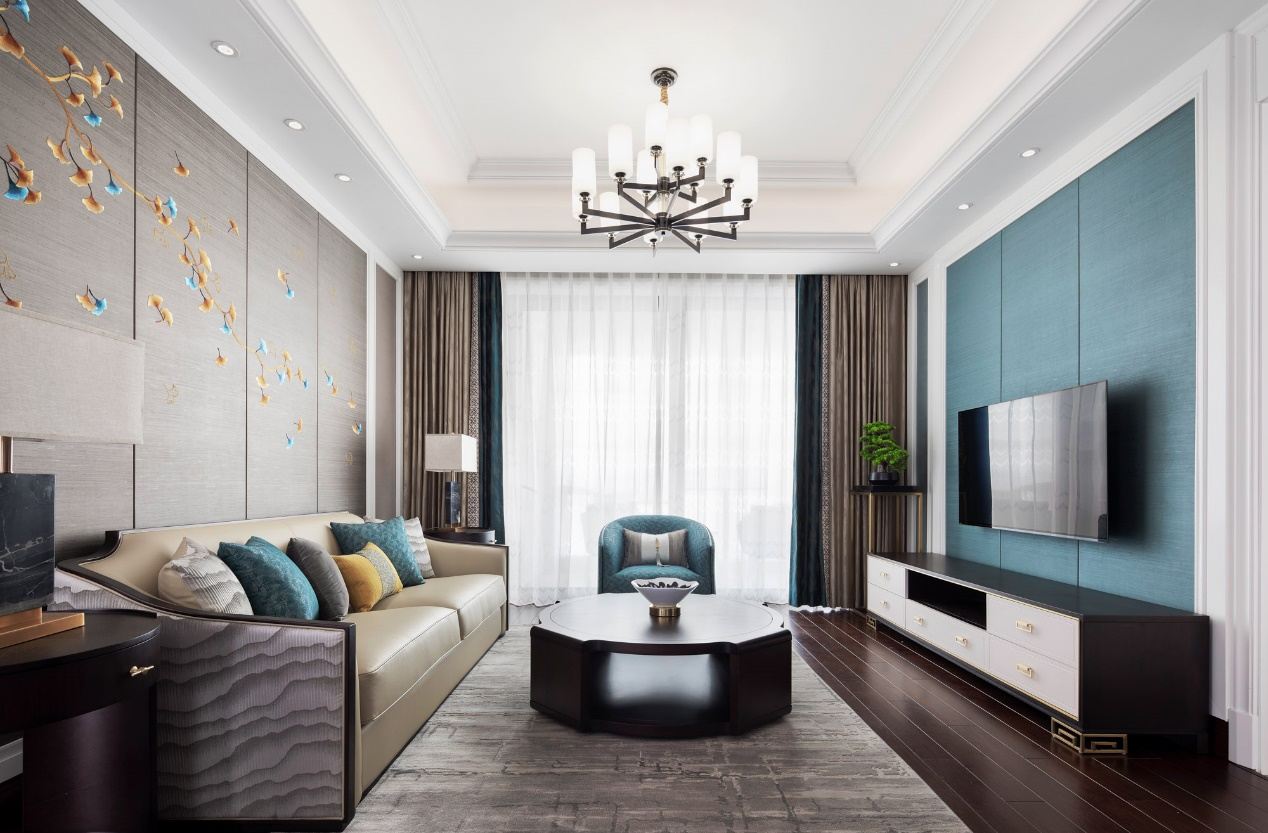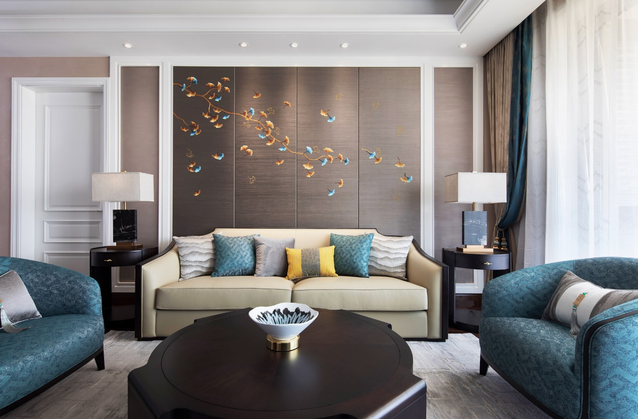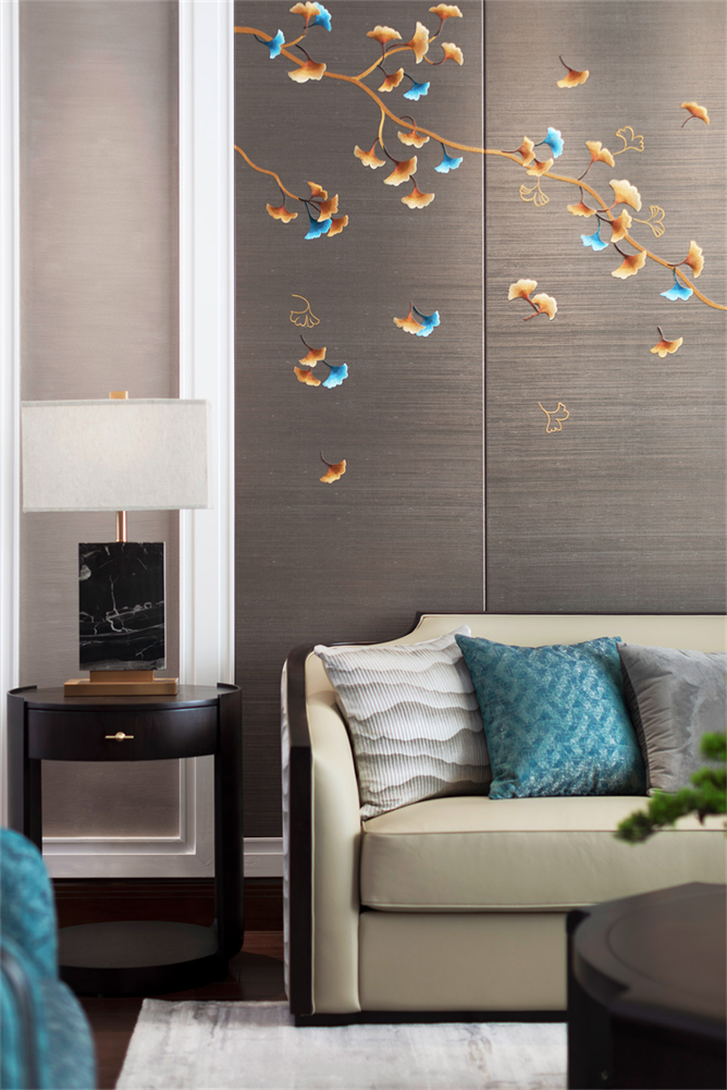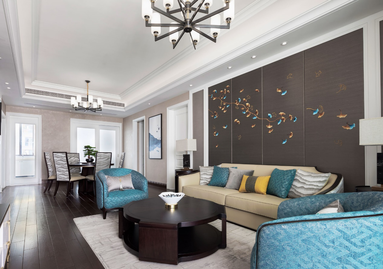 The Living Room Is Dominated By Coffee Color, With Black And Blue As The Ornament Color, Which Infuses The Oriental Atmosphere Into The Space. The Background Wall Will Be A Late Autumn Ginkgo Biloba Leaves Flutter Down.
