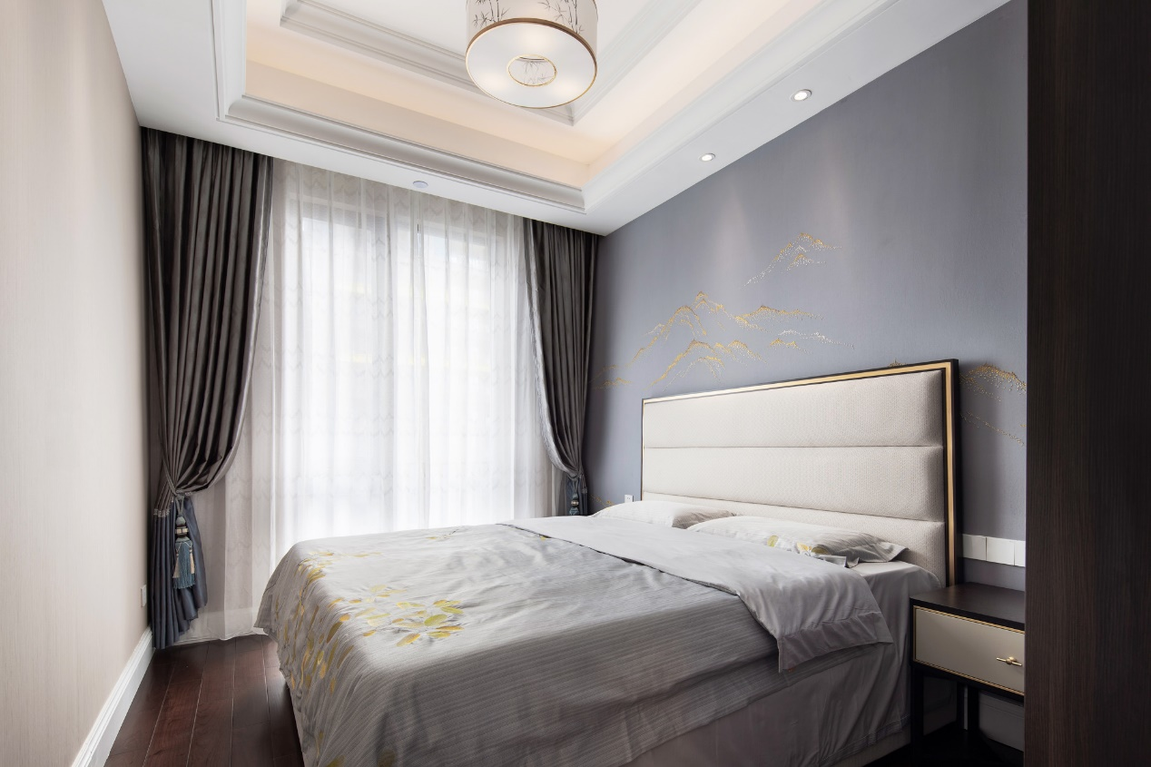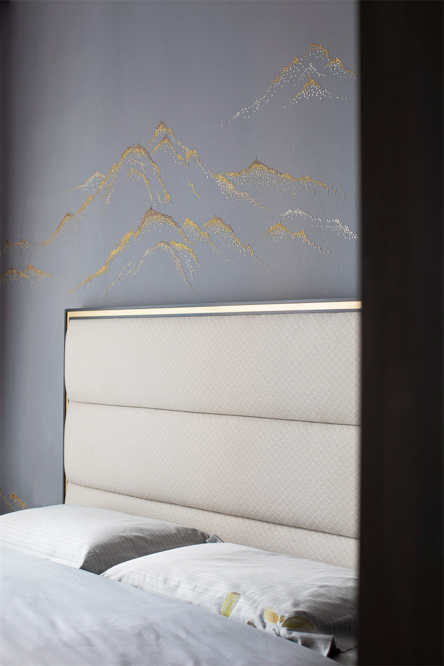 次卧背景墙延续了主卧的概念更为和谐统一,处处留白,水墨晕染。以造东方之境,成淡雅之家。「梅,花之君子者也,圣洁孤傲,傲寒绽放」大到背景墙,小到床品花纹,无一不展现主人高洁谦逊的优秀品质。