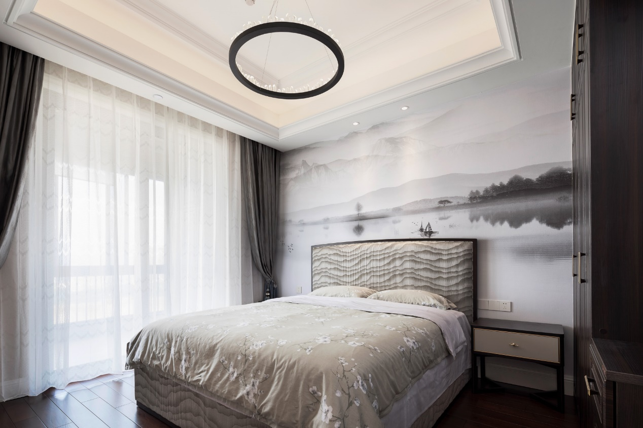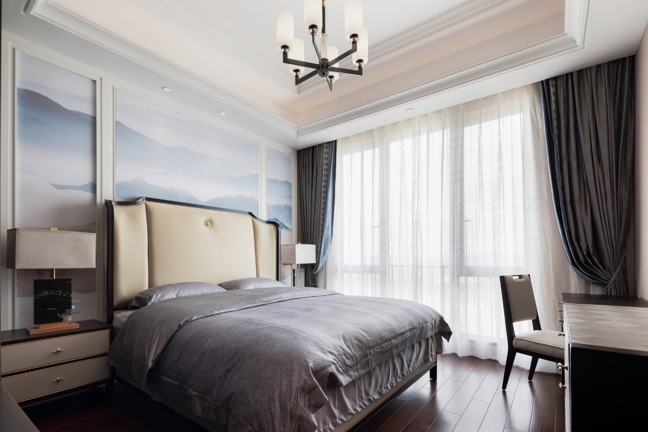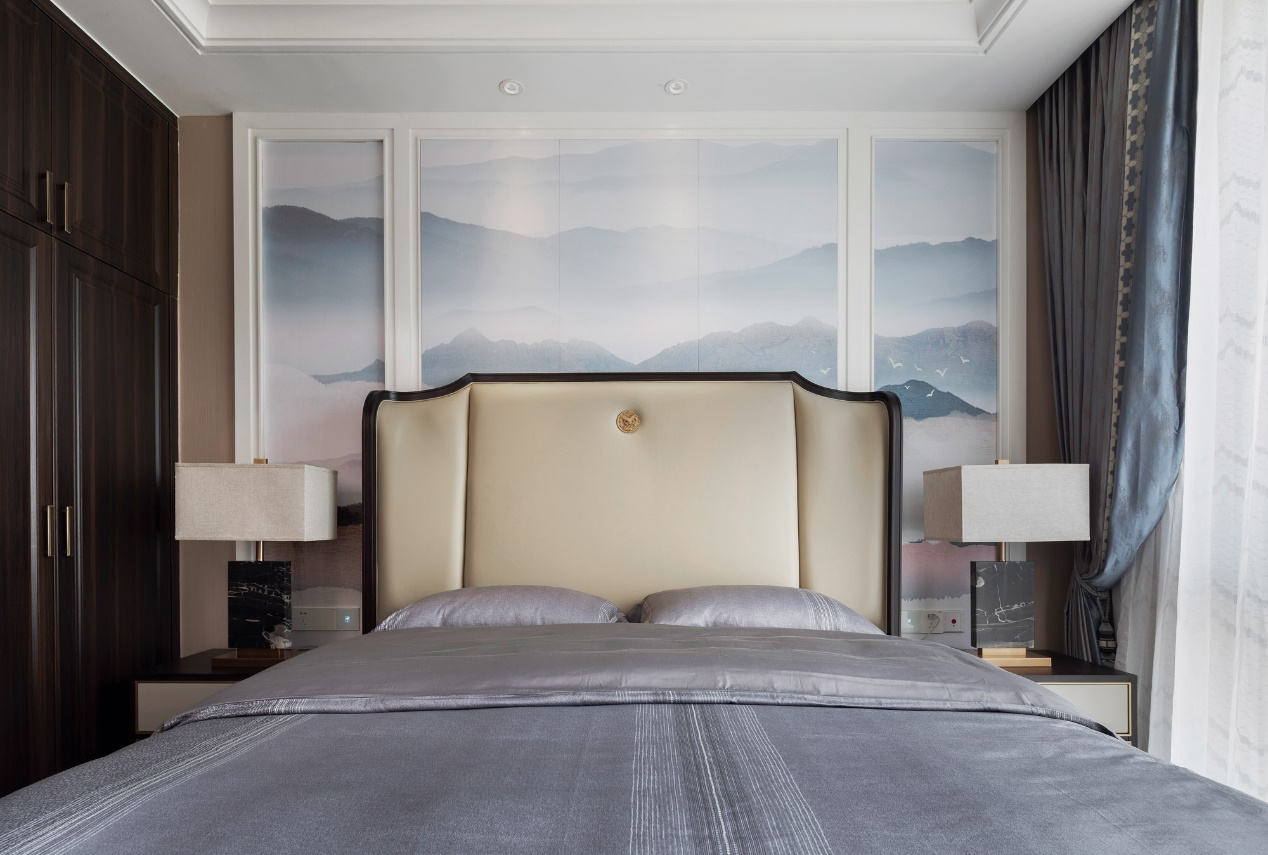 卧室通透明亮,高山流水,云雾环绕,仿佛踏入水墨丹青的画卷中,柔丽的江水裹着温和的春风,享受宁静山水之美。光影交错中,台灯将布艺和大理石两张材质完美结合,柔与刚的运用恰到好处,追求中式美学的同时,融汇西方的时尚元素。