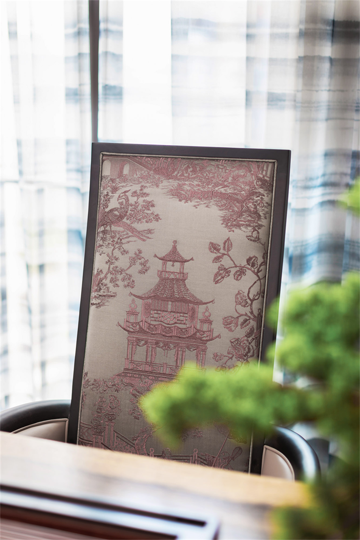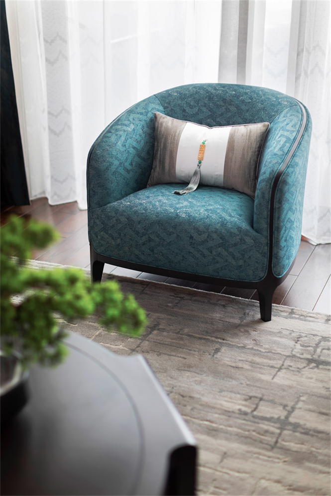 单椅柔软舒适,银色穗子点缀抱枕,东方气韵在室内流淌,气质格调跃然于精致细节上。一步一景,温润华贵的器皿,精雕细琢的装饰,造型别致的盆景,每处细节都韵味十足,了了几笔,彰显优雅贵气。