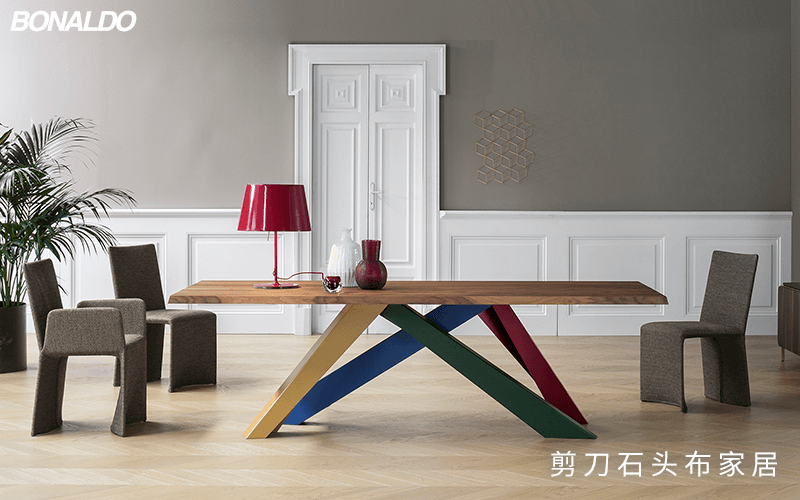 即使BONALDO总会推出各种新奇时尚的家具产品,餐桌Big Table依旧是值得一提的经典作品,Big Table与四平八稳餐桌形成鲜明对比,Big Table每个桌脚的宽度都不同。桌脚由激光切割钢板折叠制成,纵横交错的底座,无论从哪个角度都能欣赏别样的美。雕塑感的外形、靓丽浓郁的色彩,呈现艺术品般的气质。独特的桌脚设计,又赋予餐桌欢乐的戏剧感。好设计,总能为日常生活不断制造惊喜。