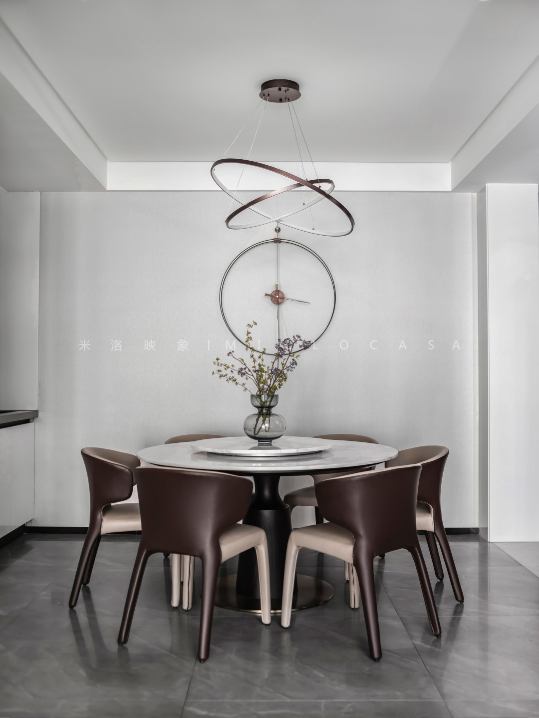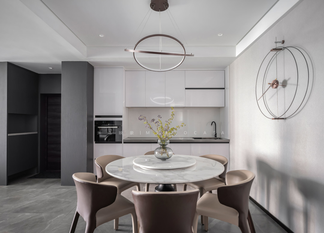 餐桌质感温润,皮革单椅肌理明晰,材质间的相互碰撞,相互平衡,则让餐厅更具现代感的利落与精致之美。