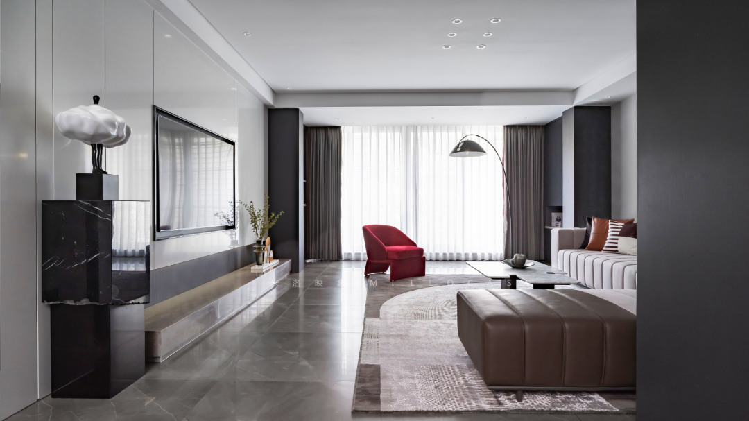 空间主旋律上选用了灰黑色,再在米咖色的基调里加入优雅而高贵的烧砖啡红色,用现代的设计手法对精致素雅进行全新的阐释,用更加理性而睿智的态度演绎高品质且简单舒适的生活态度。