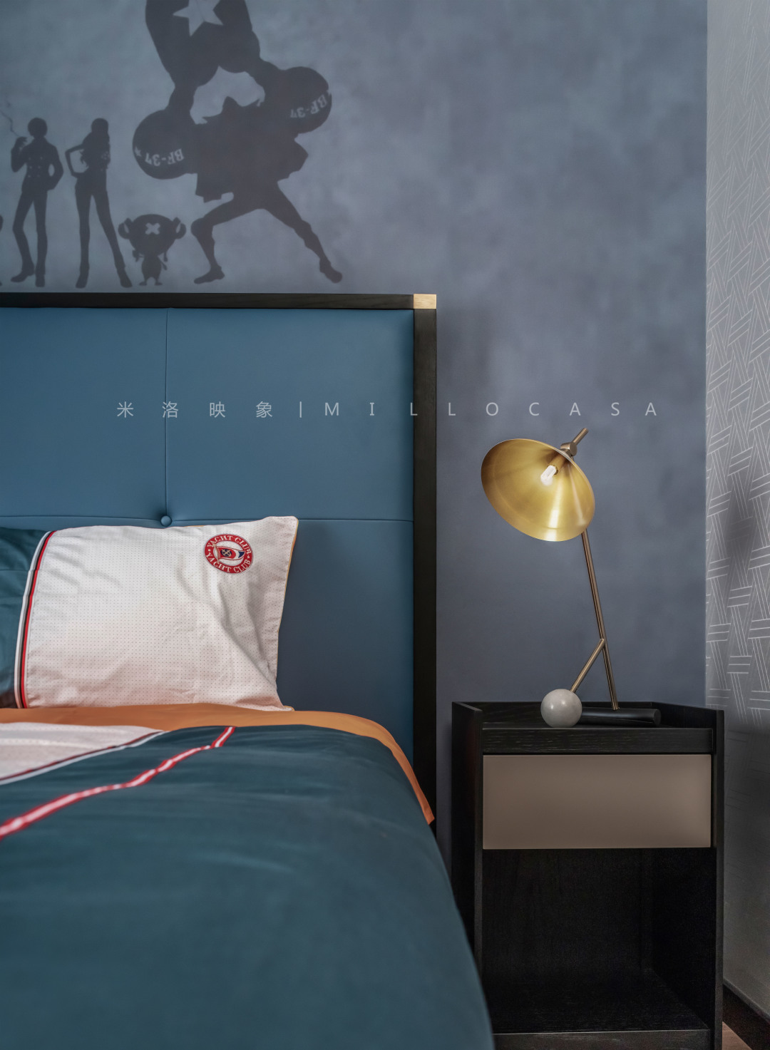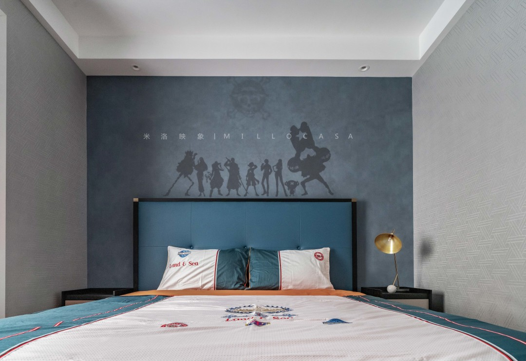 空间中蓝色的运用,让男孩房的气质如深海般沉静,背景墙上《航海王》的剪影,有趣而活泼,不仅让空间显得不再沉闷,同时也是独属于男孩子的浪漫与温柔。