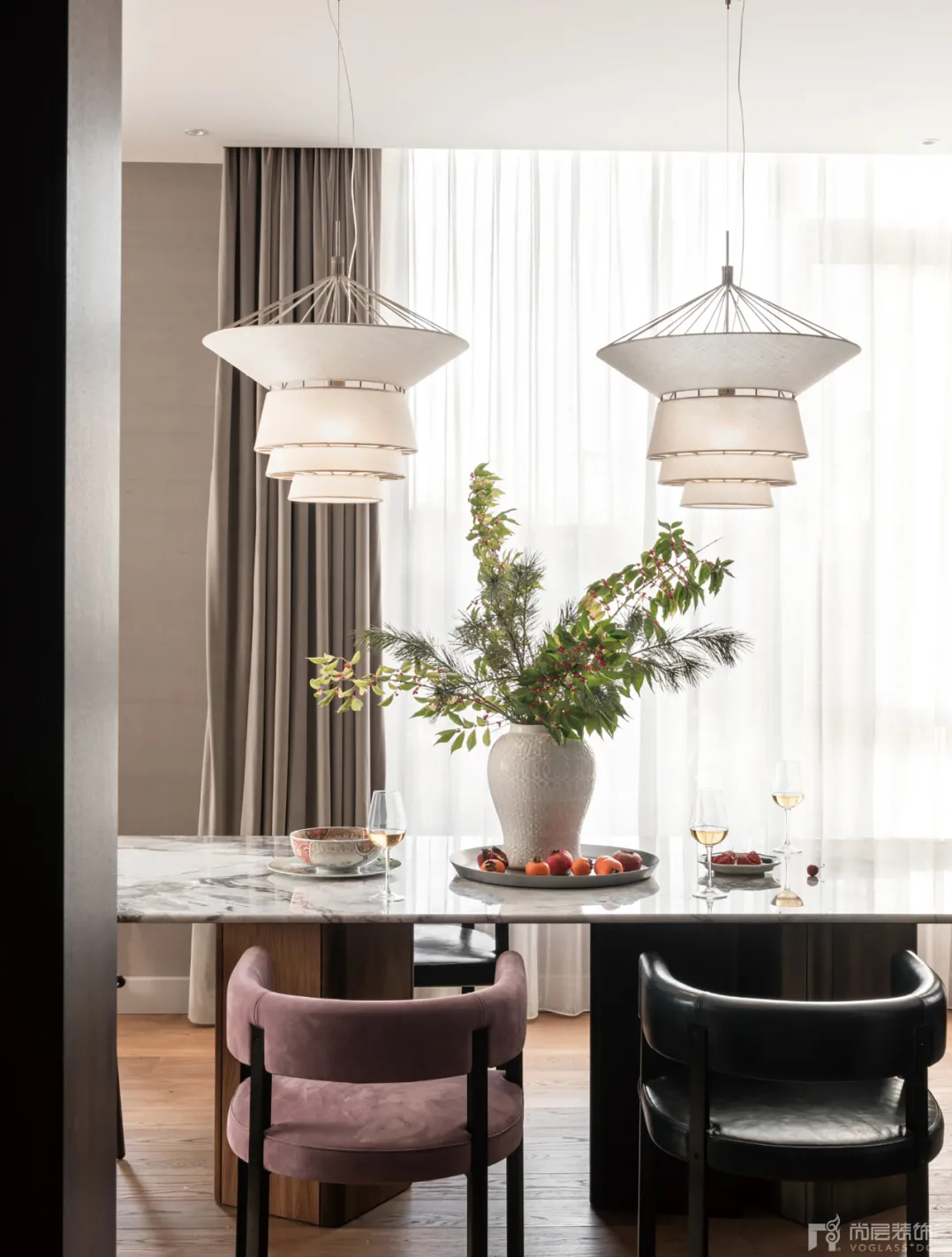 身处繁华,却又涵盖了自然的静谧祥和,设计师揉合现代的建筑风尚和中式的东方之美,让两种截然不同的风格在空间中碰撞交融,形成了空间的独特韵味,为业主营造了一处契合内心的归心之所。