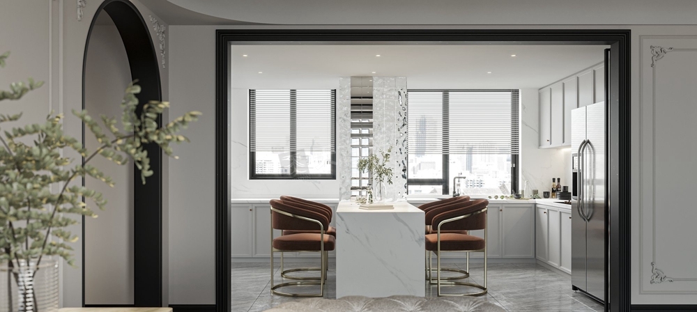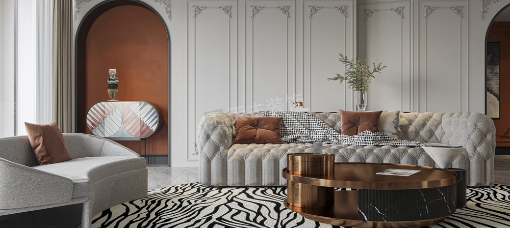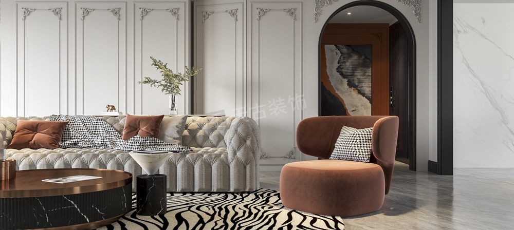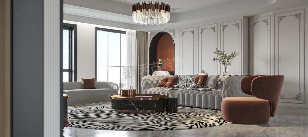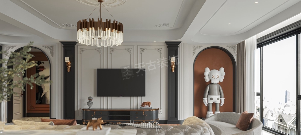 本案龙湖舜山府大平层装修案例,业主喜欢法式风格,天古装饰设计师在在法式的基础上吸取元素,做出现代法式的基调,整个房子功能设计健全,除了主要空间以外,设计师为居住者的不同喜好和需求,赋予有着各自的审美属性。石膏线条布满整个空间,所塑造的外观便有了法式的味道,跟进业主的要求,设计师还特意融合了他们的需求喜好,选择具有法式风情且简约的家具配饰,为整个客厅注入浪漫热烈的空间基调。