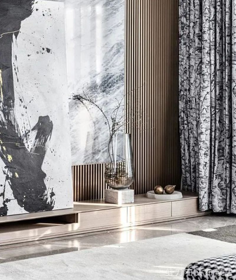 轻奢和复古风装修,离不开金属、大理石、玻璃等闪亮奢华的材质,绒布、雪尼尔窗帘质地细腻、手感厚实,光泽感、垂坠效果好,与轻奢风相得益彰。