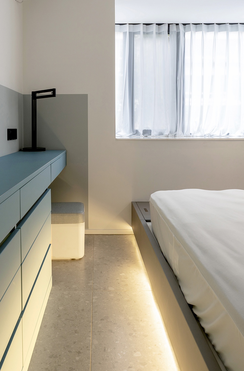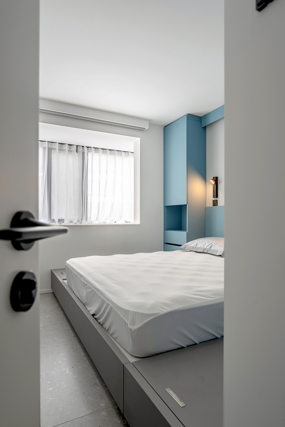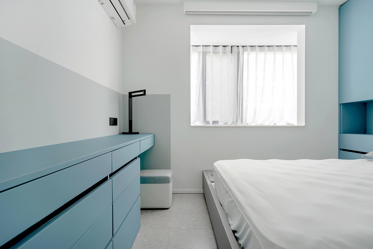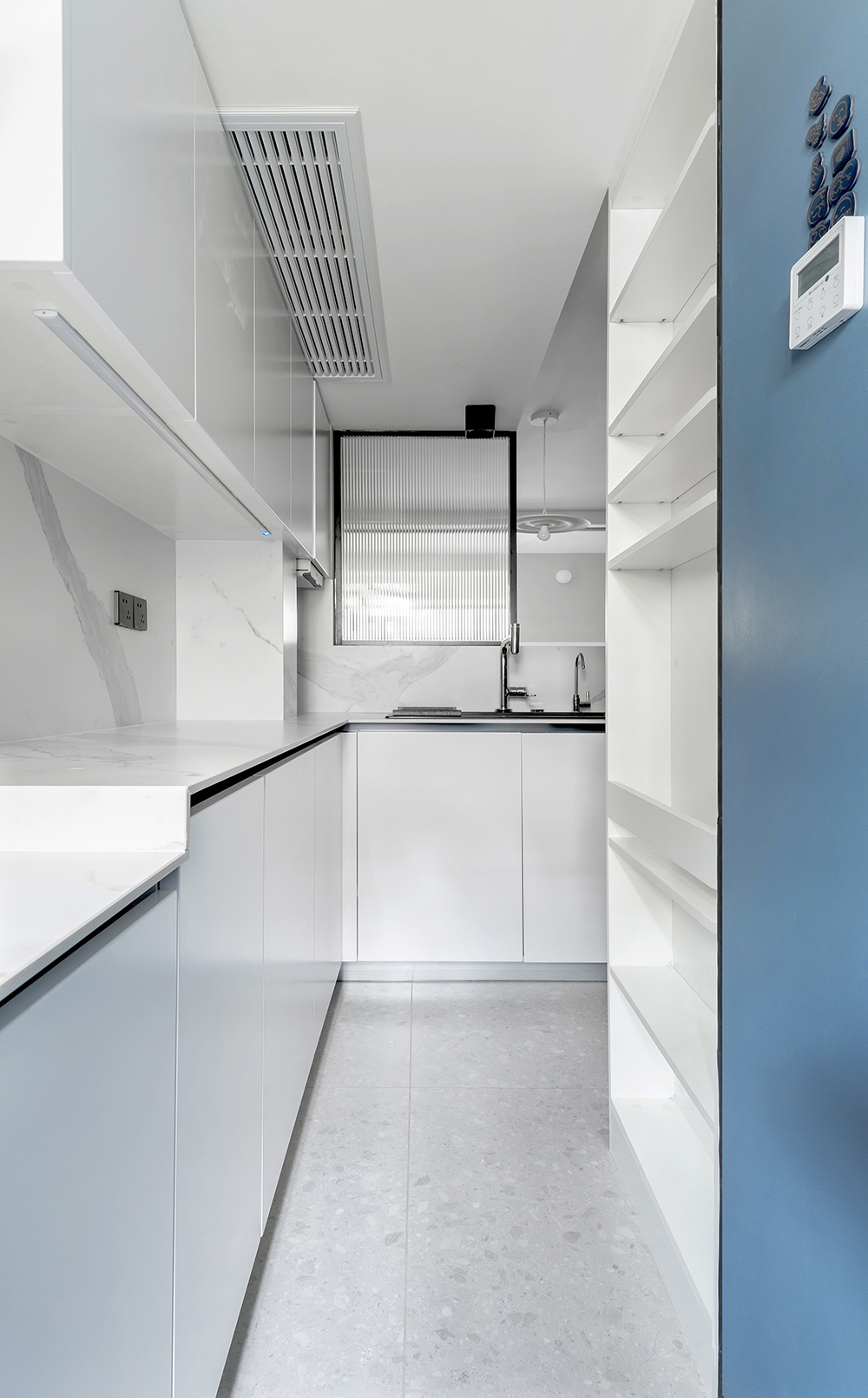 灰地+蓝柜+白墙共同组成空间的划分,并用利落的线条,刻画出细节处的精致感。