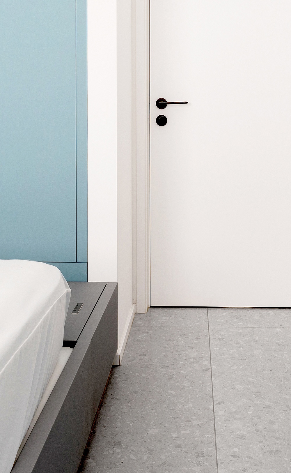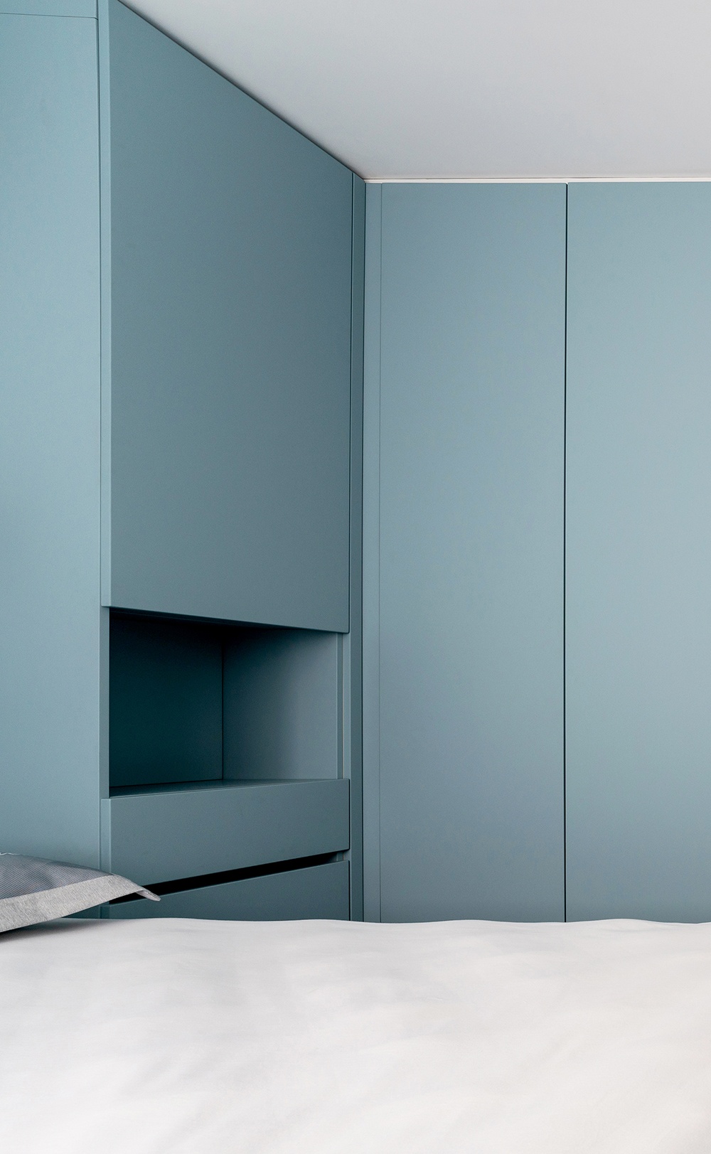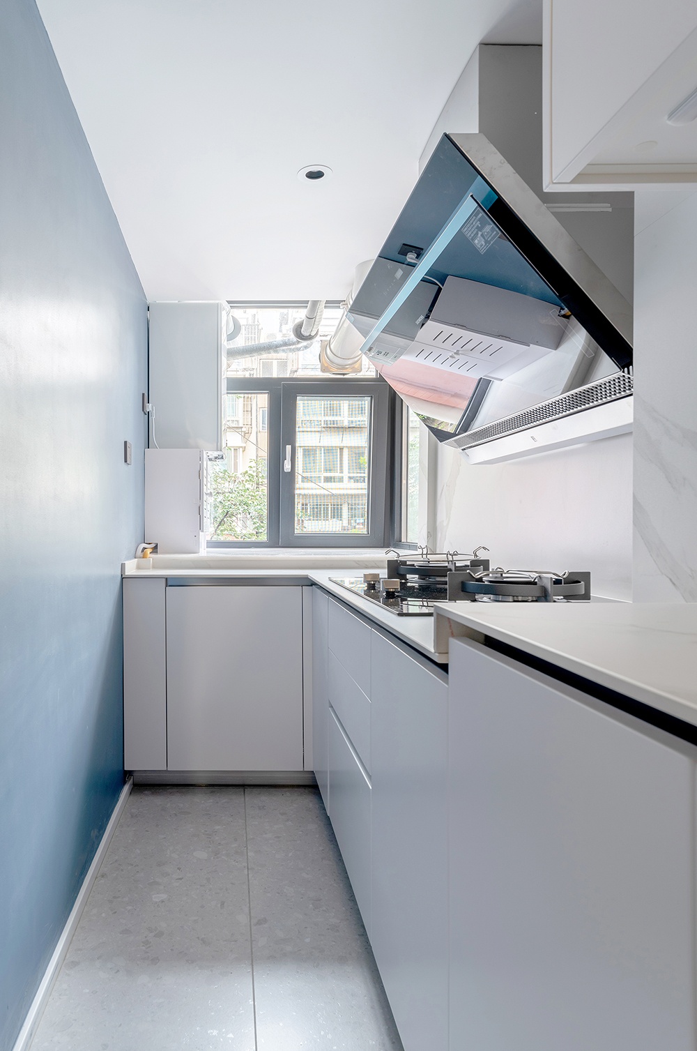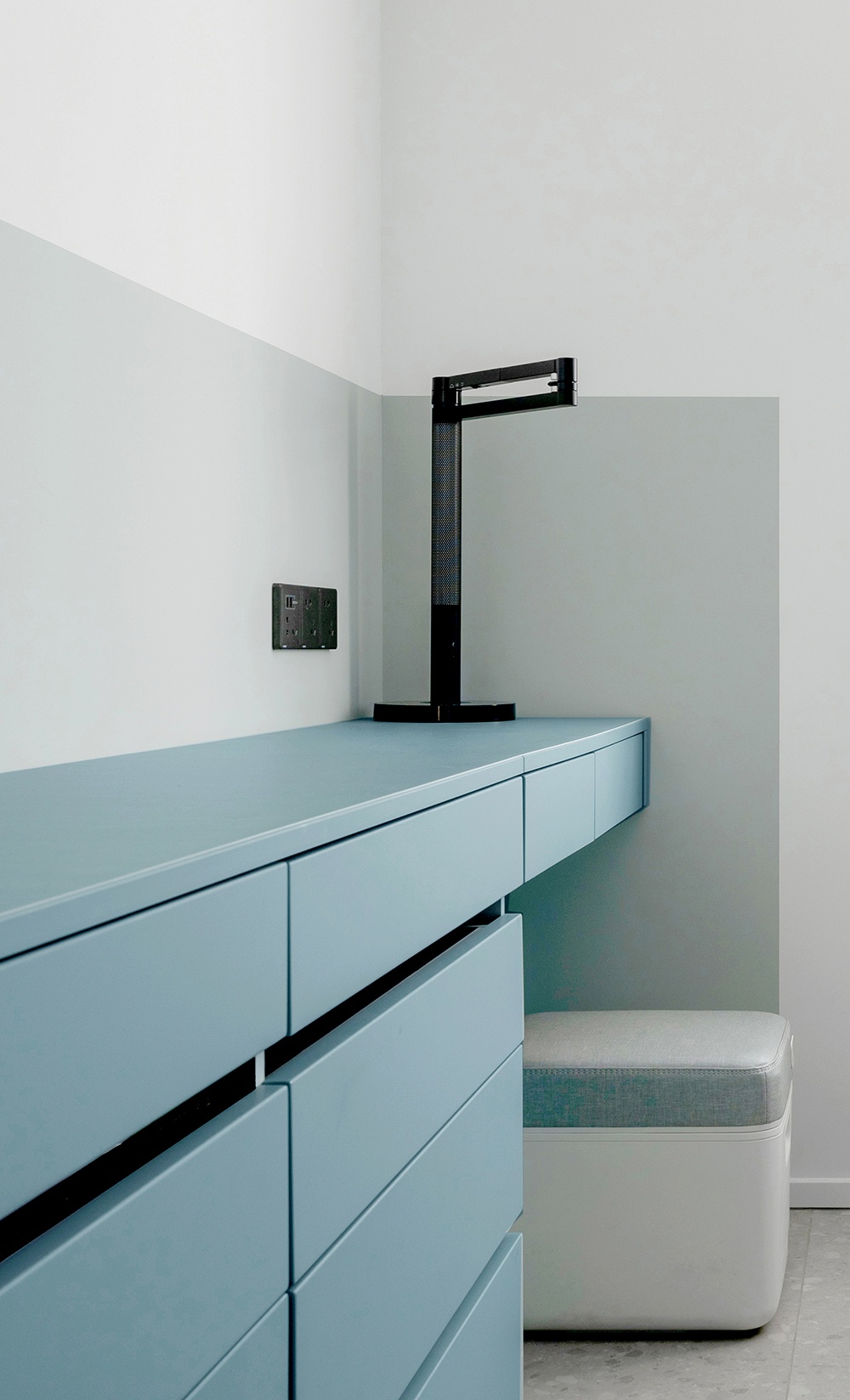 灰地+蓝柜+白墙共同组成空间的划分,并用利落的线条,刻画出细节处的精致感。