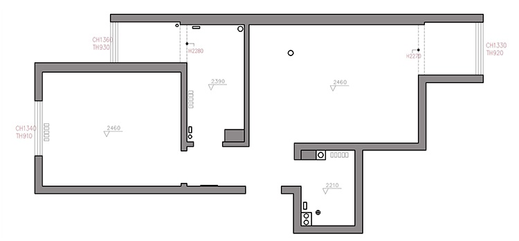 原户型的承重结构比较多,不过好在中间厨房位置的墙体是可拆改的,这就为设计师的改造思路提供了方向。卫生间空间有限,无法实现干湿分区。大转角的厨房,空间不好利用容易产生浪费的情况。