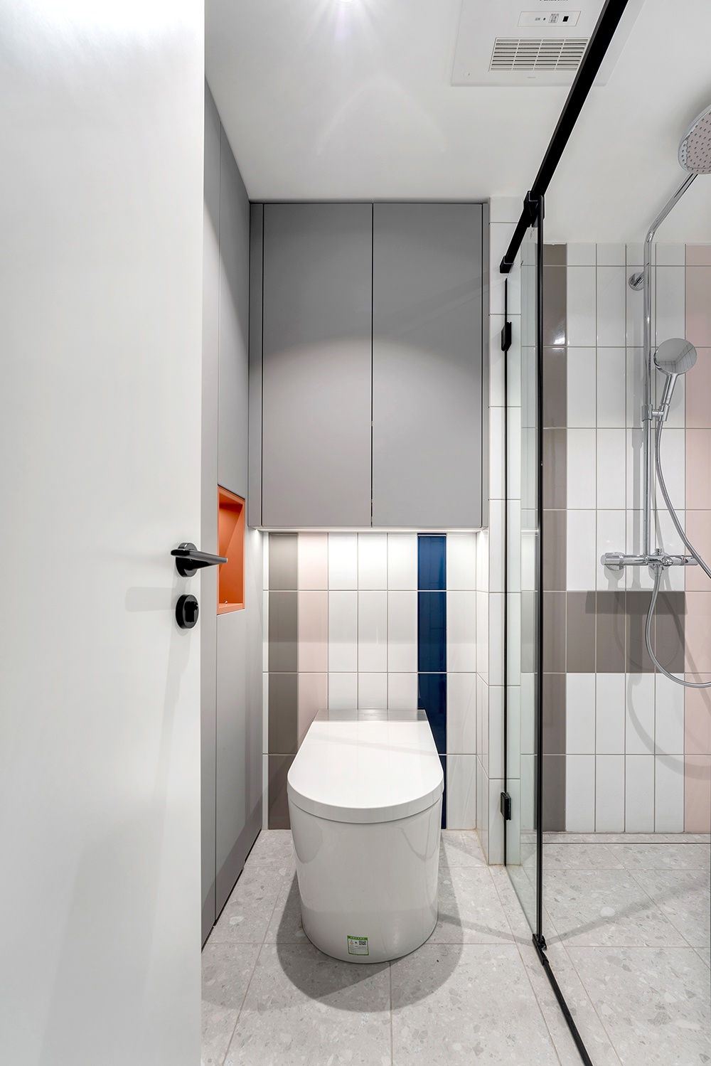 隐藏式水箱顶部内嵌收纳吊柜,充分利用每一寸空间。黑色窄框玻璃隔断打造的一字型淋浴房,避免空间显得压抑。