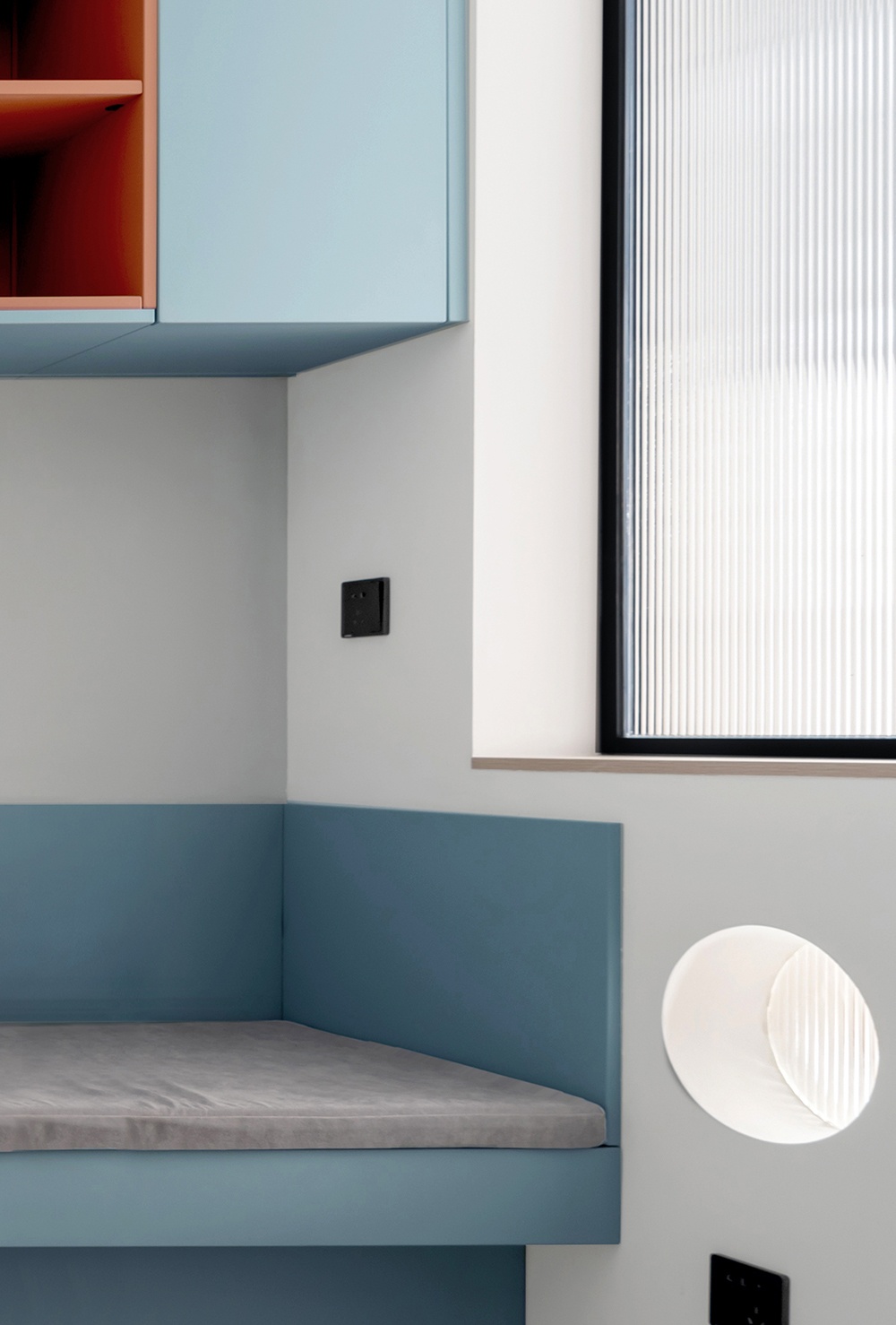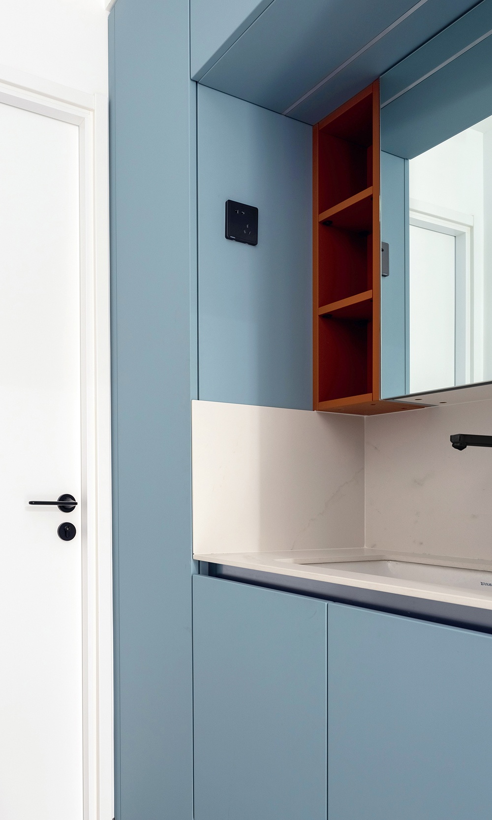 洗手台与镜柜之间,利用石材包围三面作为挡水,隔绝水渍的同时又容易打理。镜柜处选用橙色开放格和蓝色柜门进行组合,形成对比营造冷暖交汇的视觉平衡。