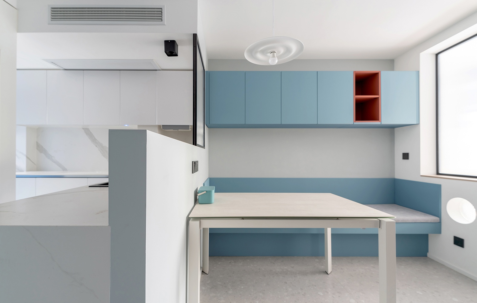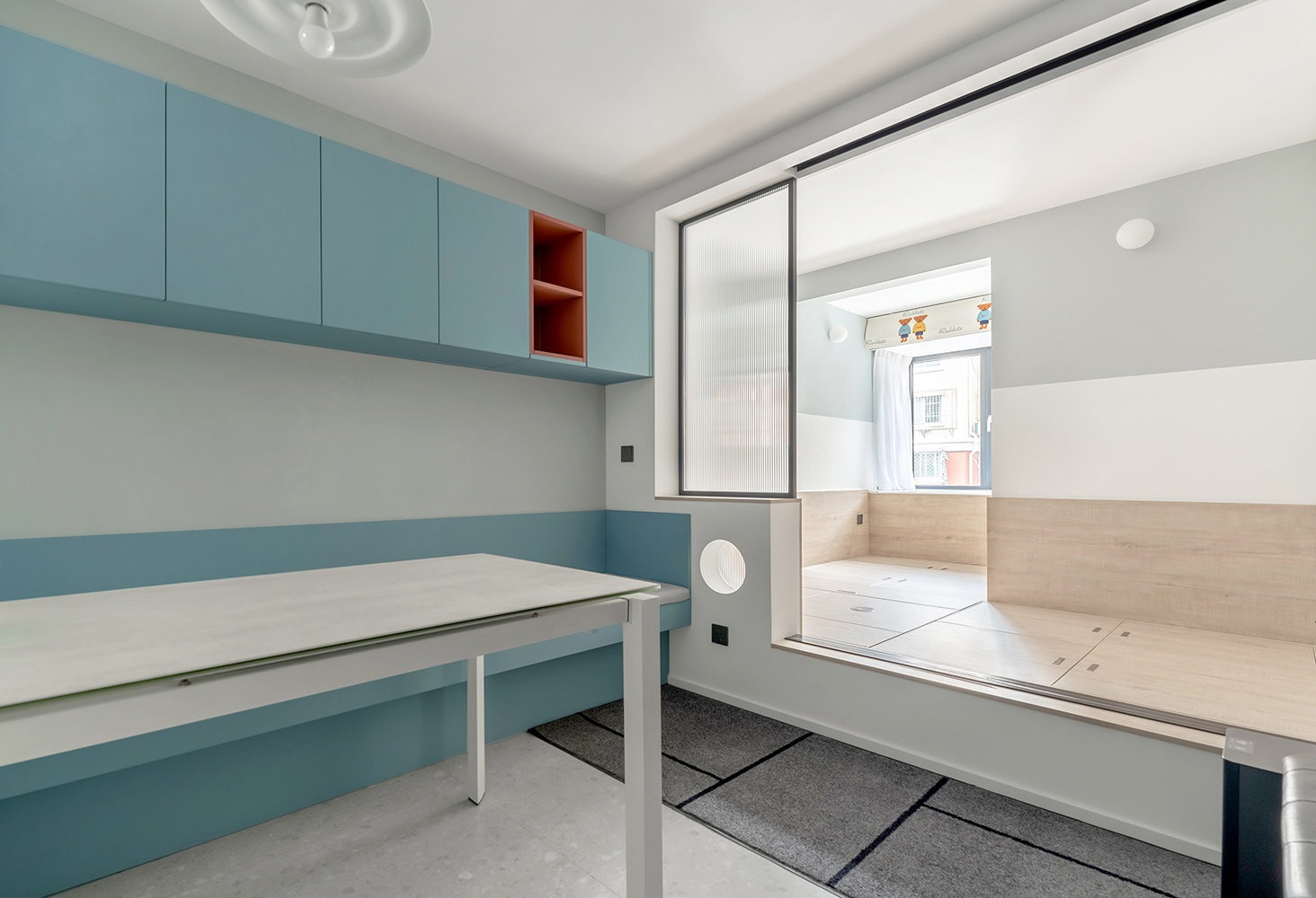 餐厅卡座旁的墙壁,设计了一个圆洞作为猫咪的动线活动区,同时还能提升装饰性和趣味性。隔断采用长虹玻璃,提升餐厅南向的采光。