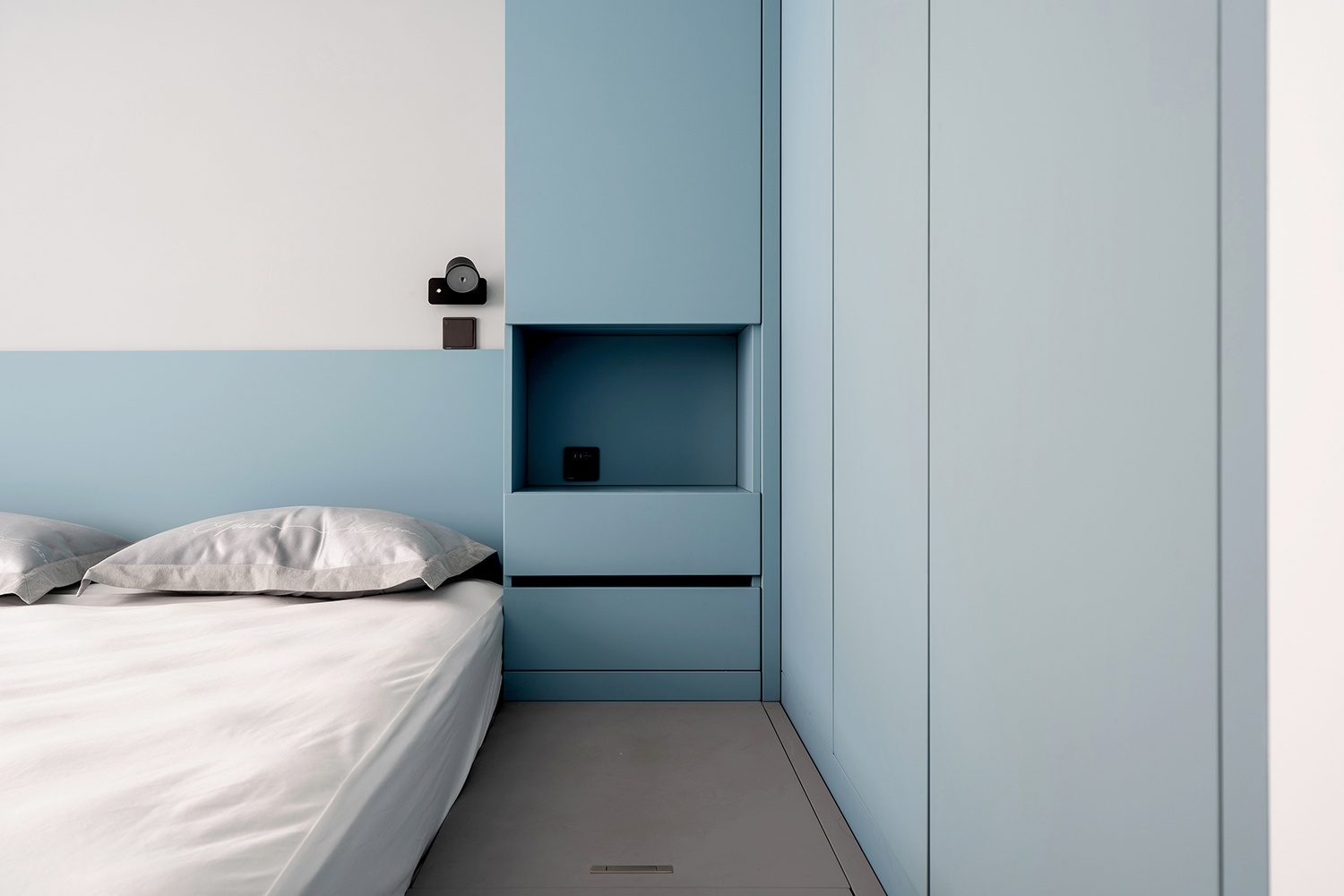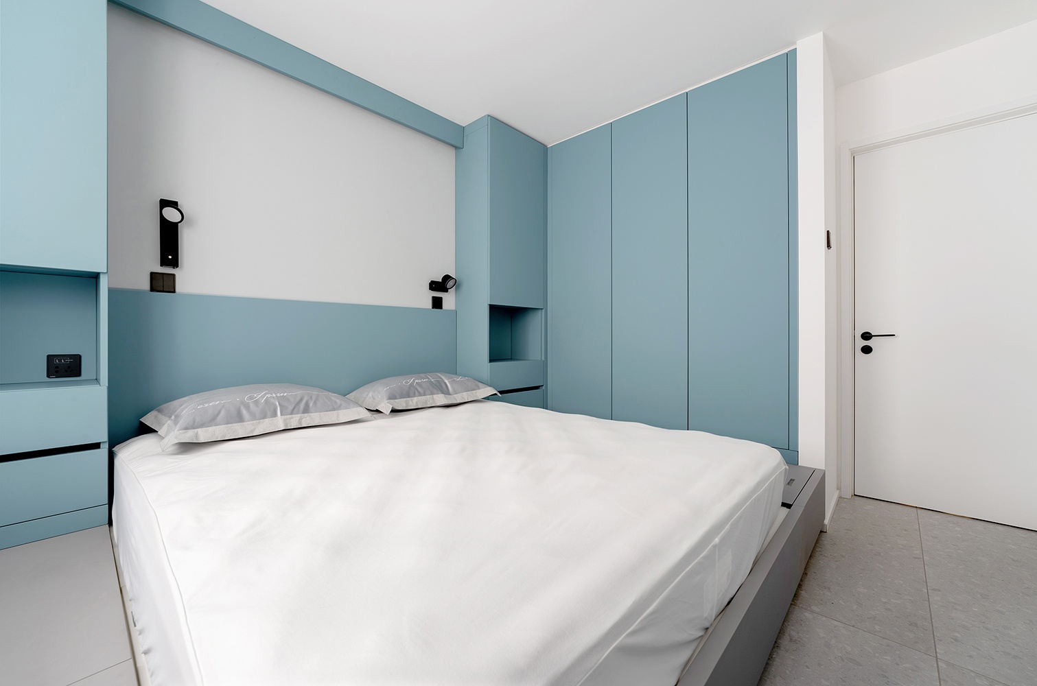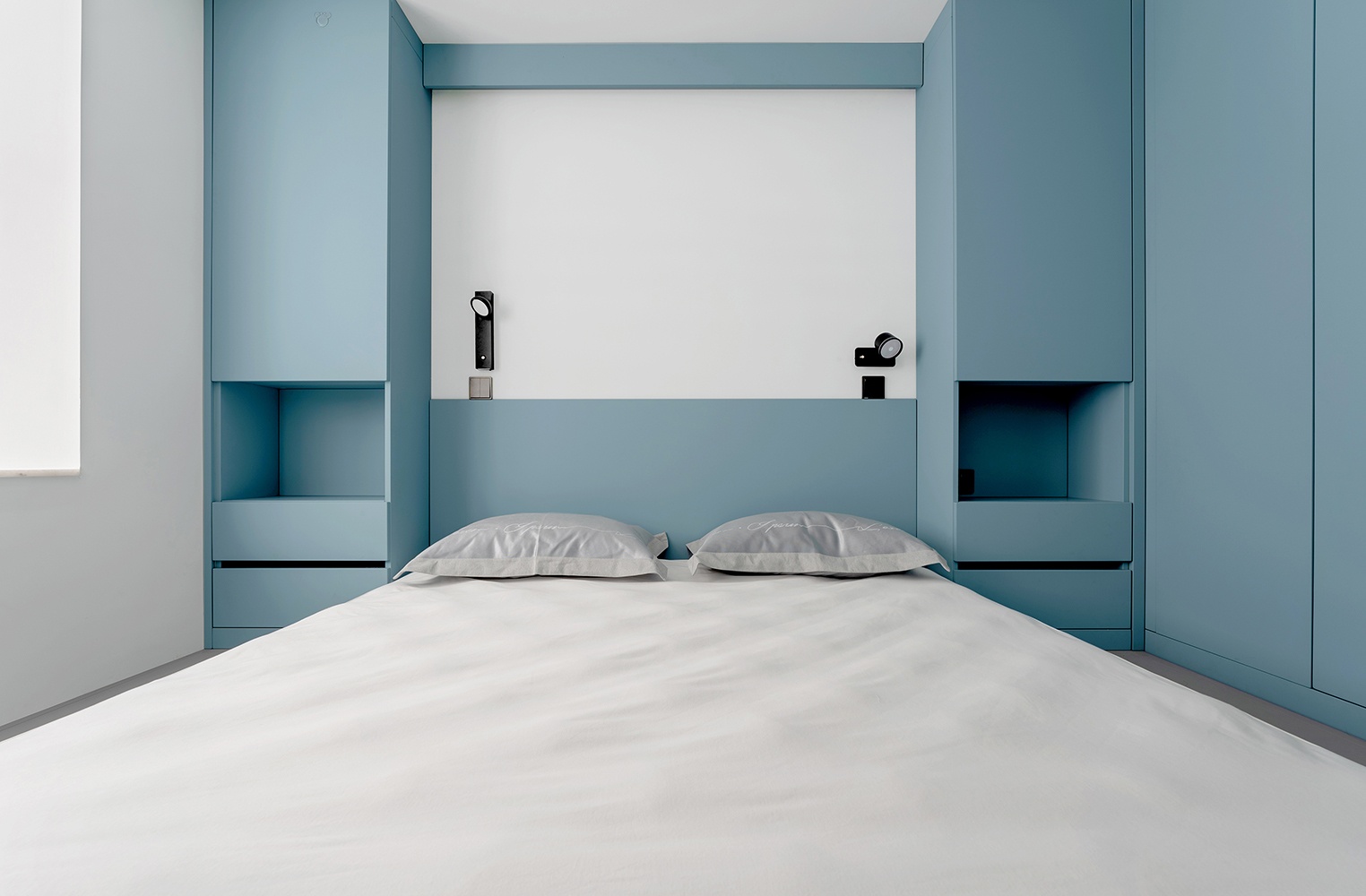 主卧室以灰蓝色为主要色调,再穿插白色的墙面,让整个卧室舒缓沉静。为了避免空间过于清冷,利用暖色壁灯烘托温馨的氛围。