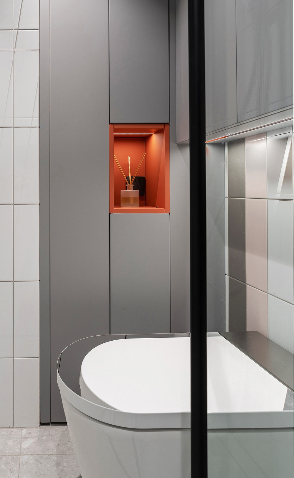 灰色浴室杂物柜用于存放备用的洗浴用品,橙色开放格不仅可以增加对比提升装饰性。还可以摆放香薰和小盆栽,改善空气质量。
