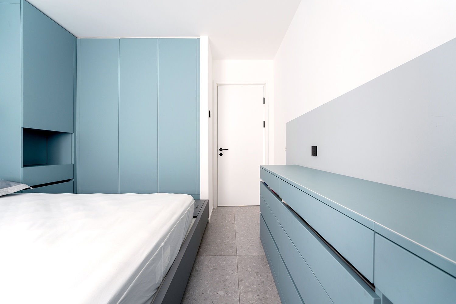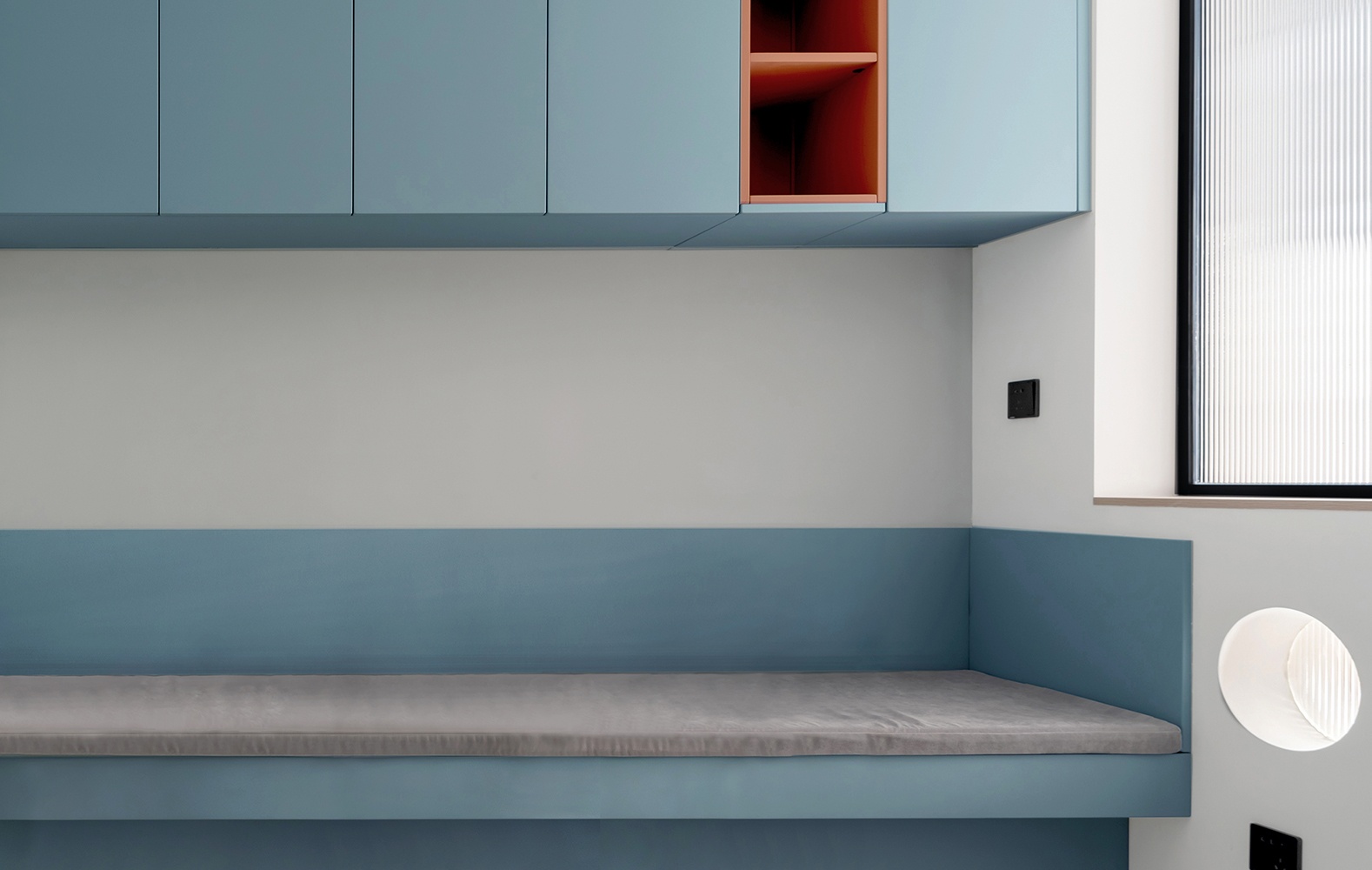 蓝色定制家具搭配白色墙面,给人一种干净清爽的感觉。蓝白相间的色彩搭配,也赋予空间一种浪漫的感动。
