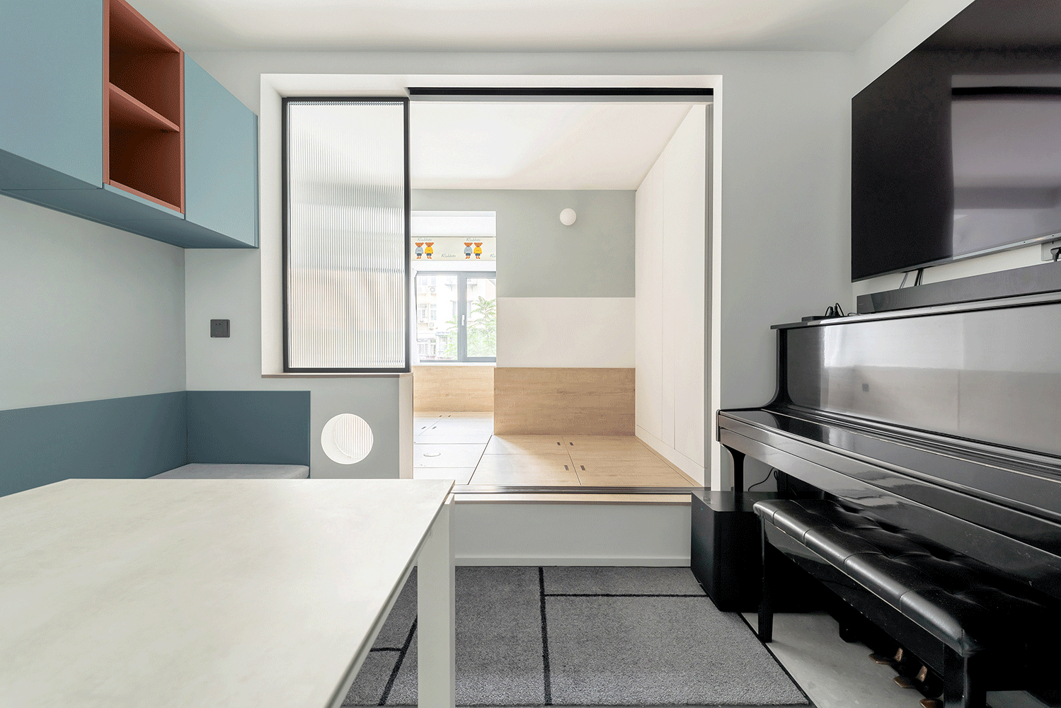 客厅+餐厅+琴房三位一体,充分提升了空间的利用率,还能弱化局促感。南向的儿童房采用全面地台,充分满足收纳所需。定制长虹玻璃三联动门,让采光和私密性都能得到保障。
