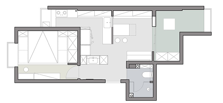3.通过拆除厨房隔断墙,对空间进行了重新规划。增加了家政柜和洗漱区,不仅解决了卫生间干湿分离的问题,也提升了空间实用性和利用率。