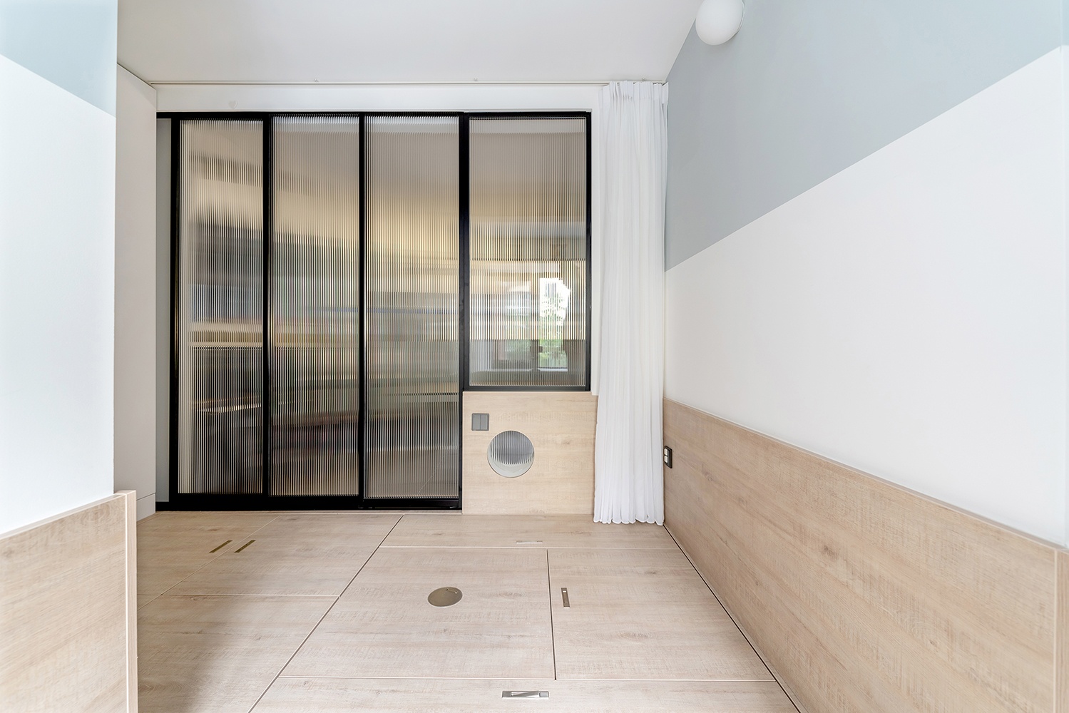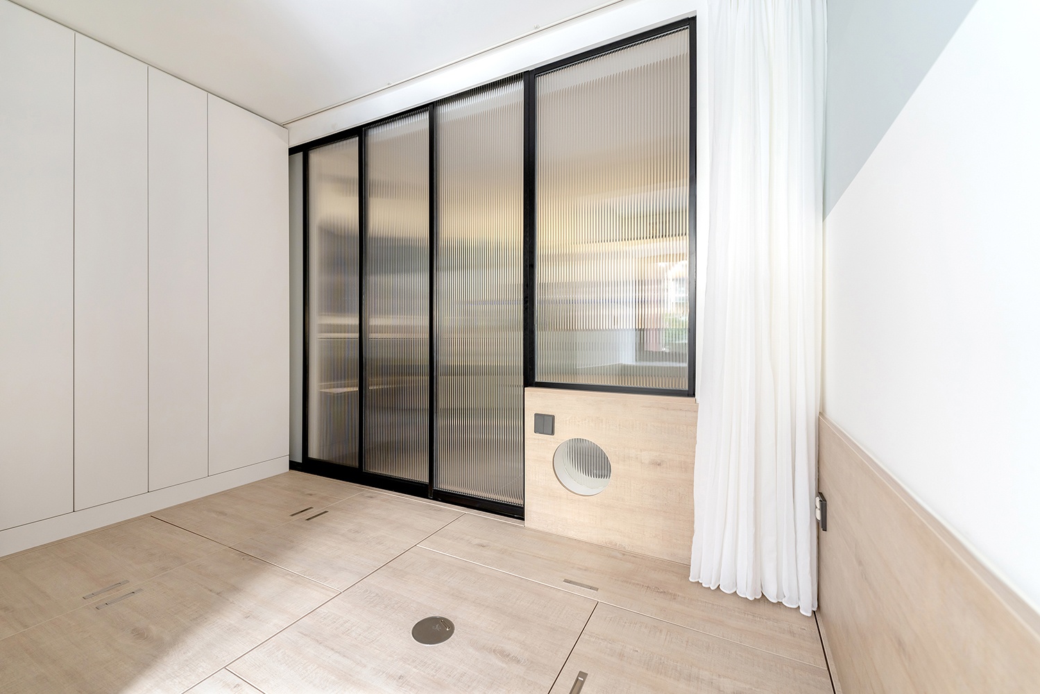玻璃移门的轨道隐藏在地台上,降低突兀感也便于打扫。三扇移门都可以隐藏在墙壁里,减少空间的占用,更显通透。
