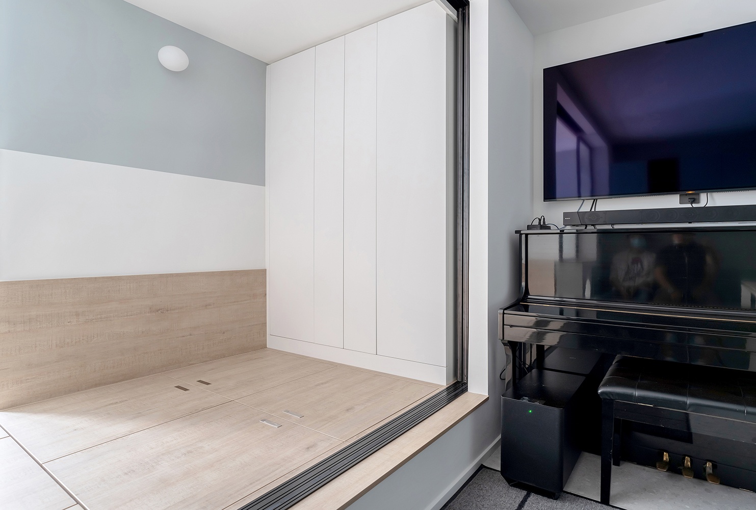 地台底下也安装了感应灯带,柔和的光线。可以避免起夜时,影响另一半休息,安全又贴心。