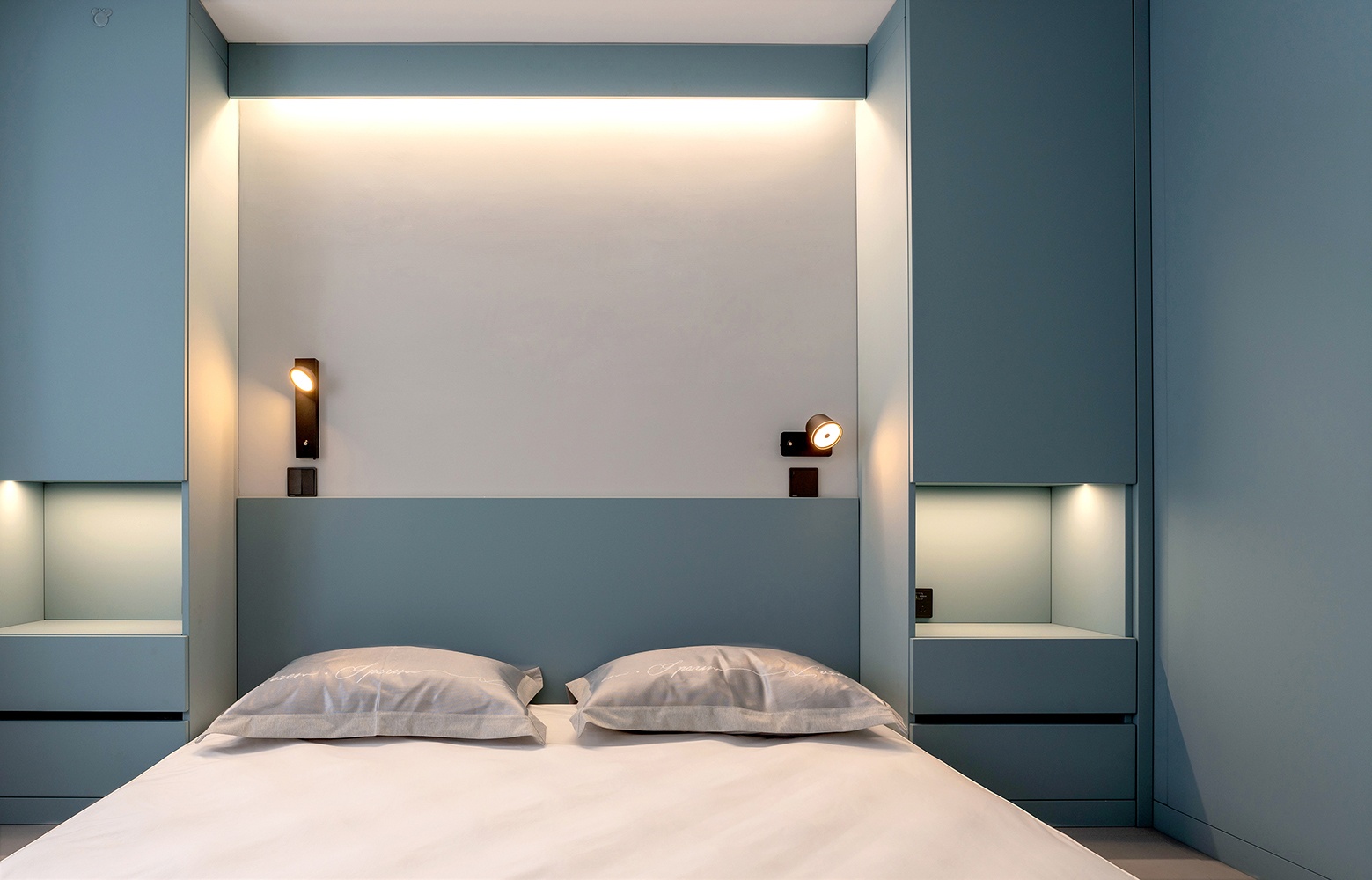 床头配备了壁灯+灯带,烘托卧室温馨的氛围感。蓝色的柜子搭配暖色灯光,刚好形成冷暖搭配,焕发了空间活力。