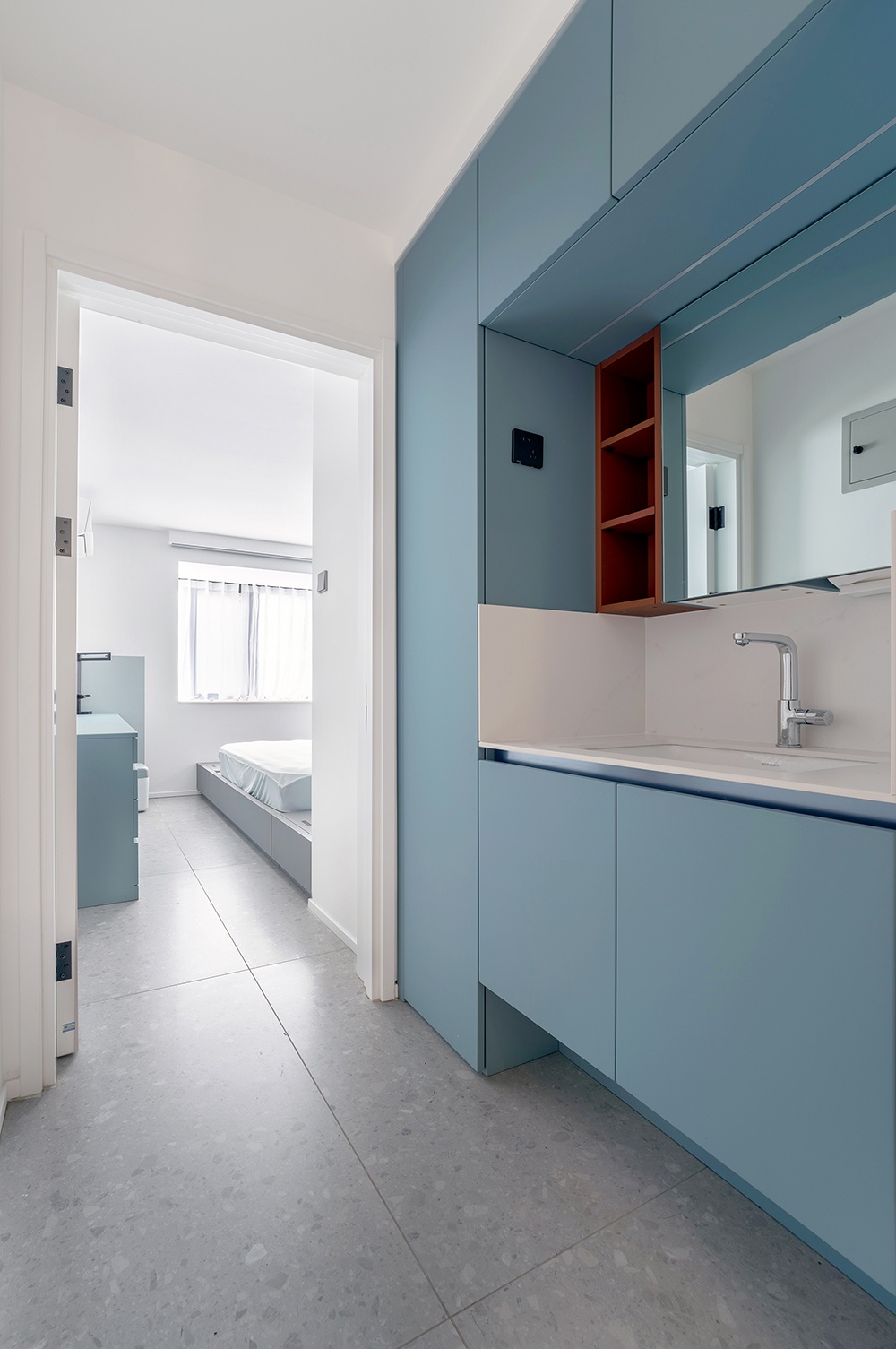 通往卧室的走廊是干湿分离的洗漱区,整体长1700mm,宽度568mm,完全以储物柜形式进行装饰,整齐又统一。