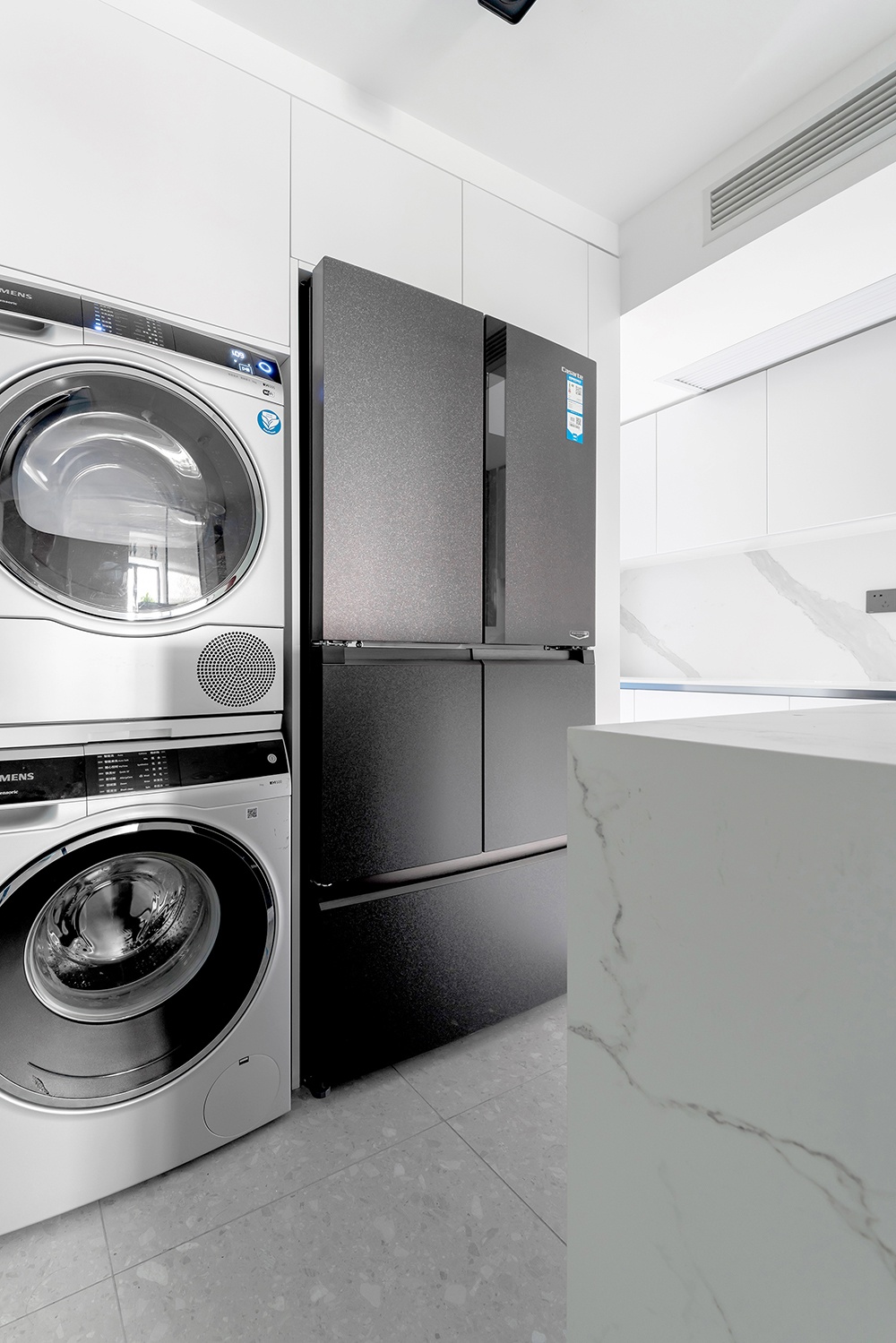 洗衣机+烘干机+双开门冰箱,与家政柜相结合,整体更显统一。同时还能留出800mm的过道空间,合理的利用空间提升动线的流畅性。