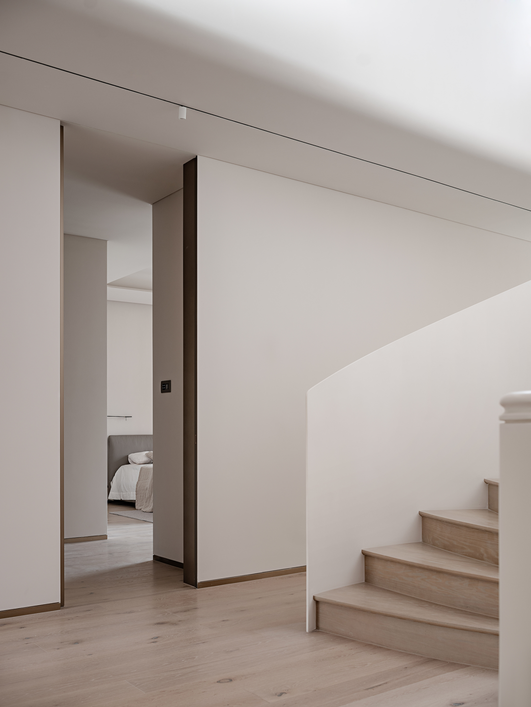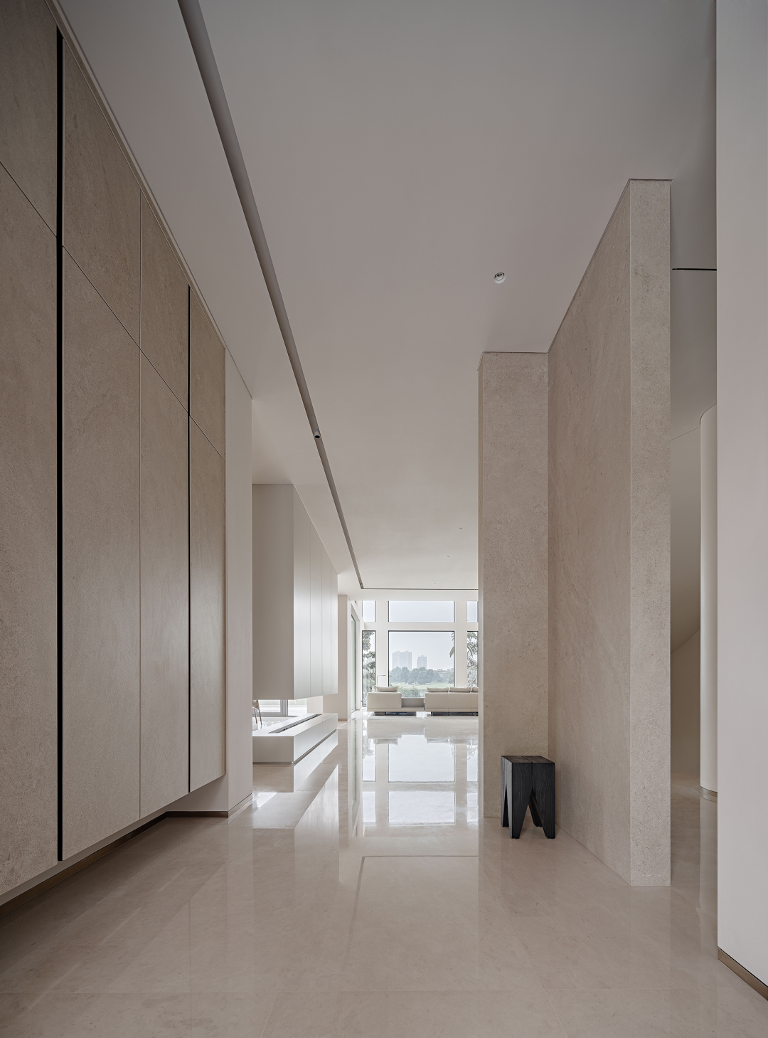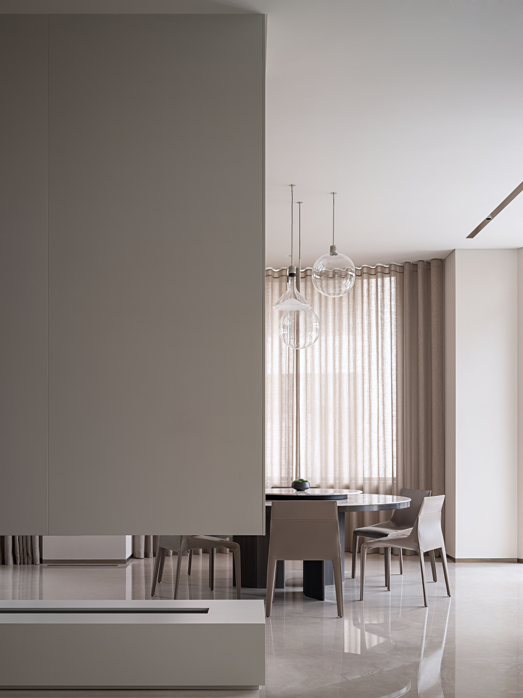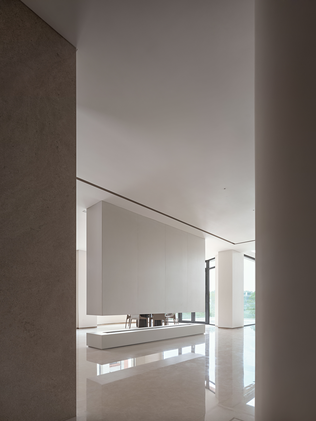 为了使整个项目自然纯粹,在材料选择上,我们尽量减少材料的种类,所以整个项目的硬装材料只有两种涂料,一种岩板,一种石材,一种木地板,而且几种材料的色系都是统一的,以这样的方式呈现意味着对空间感,工艺,细节,产品都提出了更高的要求,不然整个空间会平淡无奇。