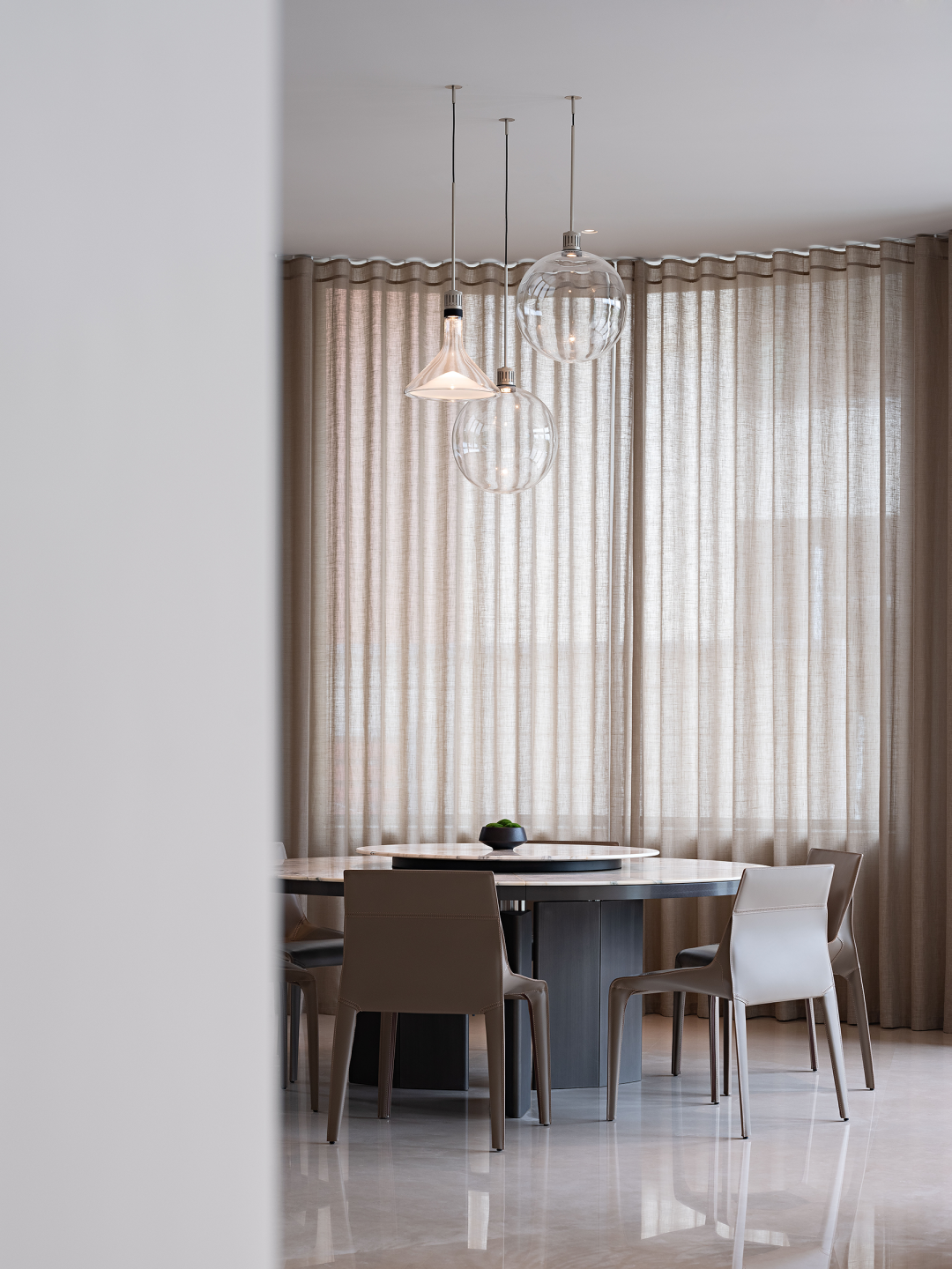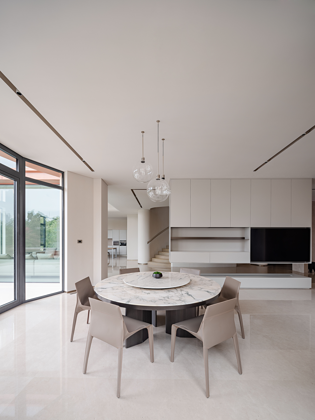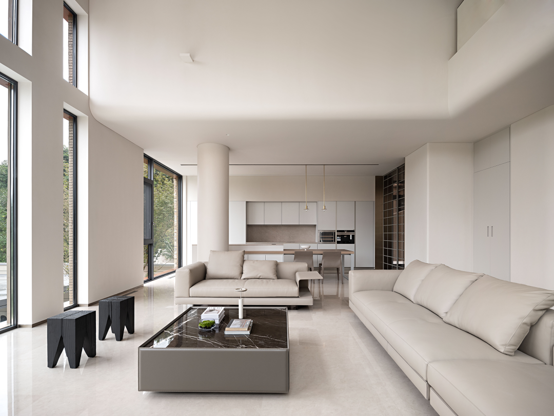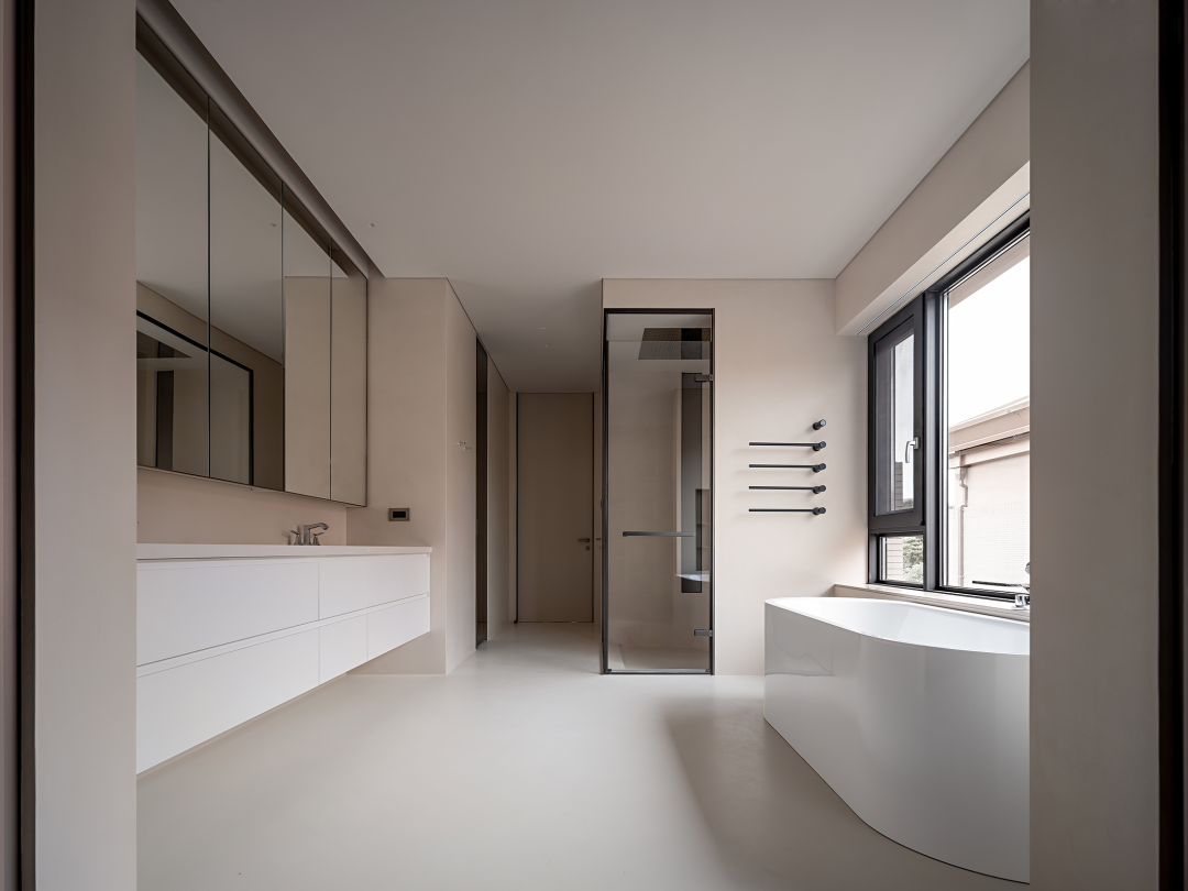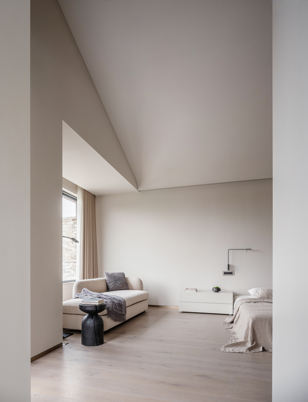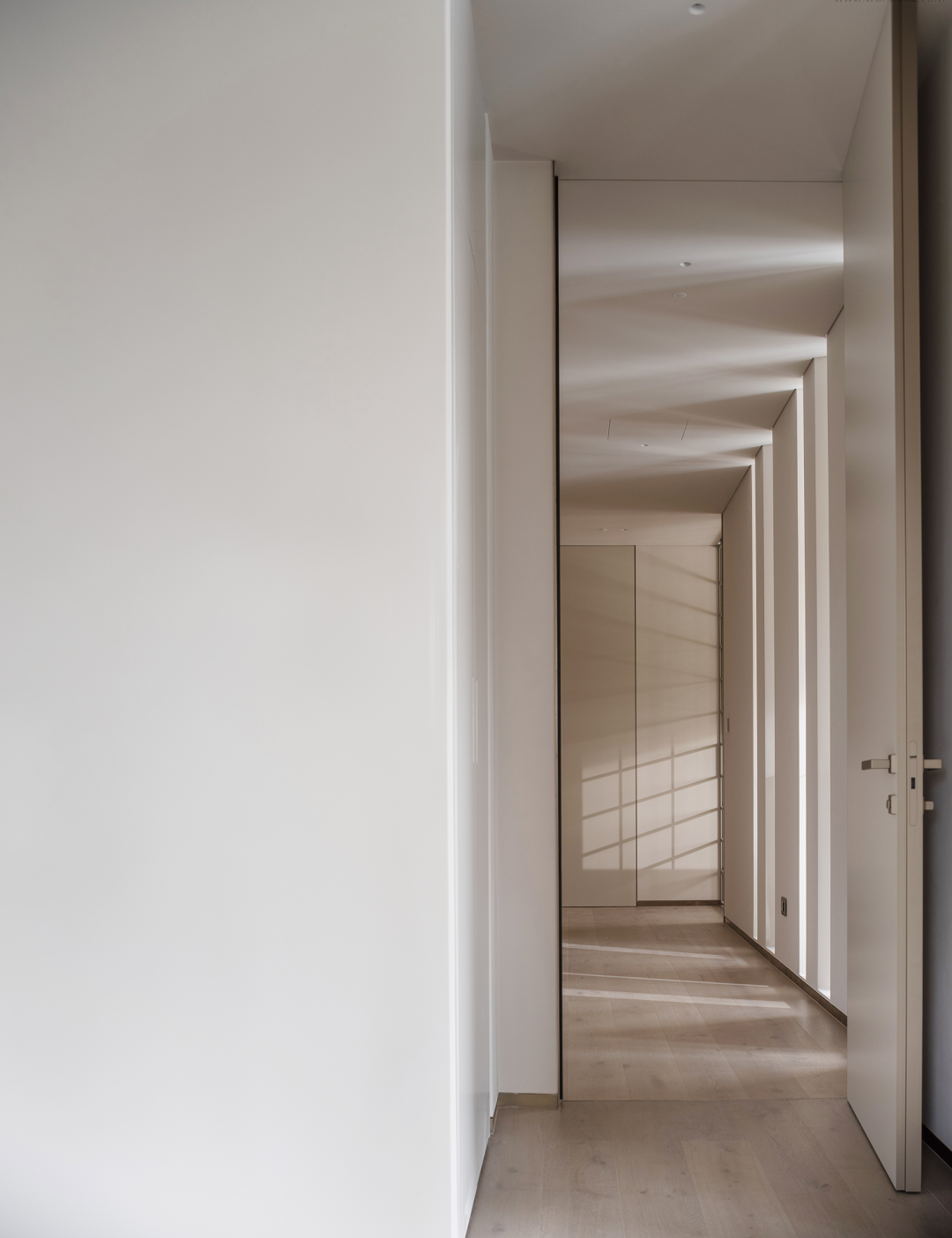 为了使整个项目自然纯粹,在材料选择上,我们尽量减少材料的种类,所以整个项目的硬装材料只有两种涂料,一种岩板,一种石材,一种木地板,而且几种材料的色系都是统一的,以这样的方式呈现意味着对空间感,工艺,细节,产品都提出了更高的要求,不然整个空间会平淡无奇。