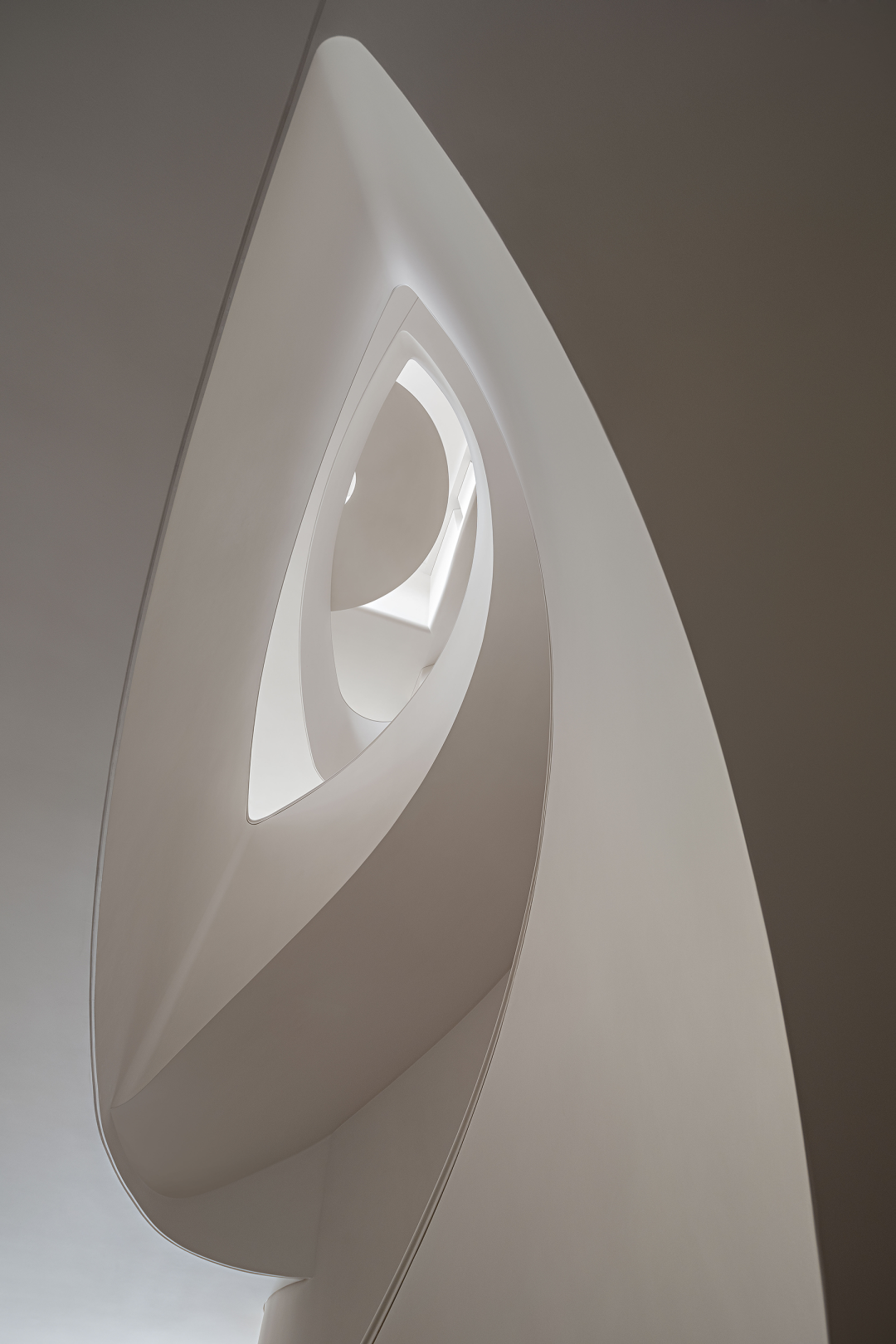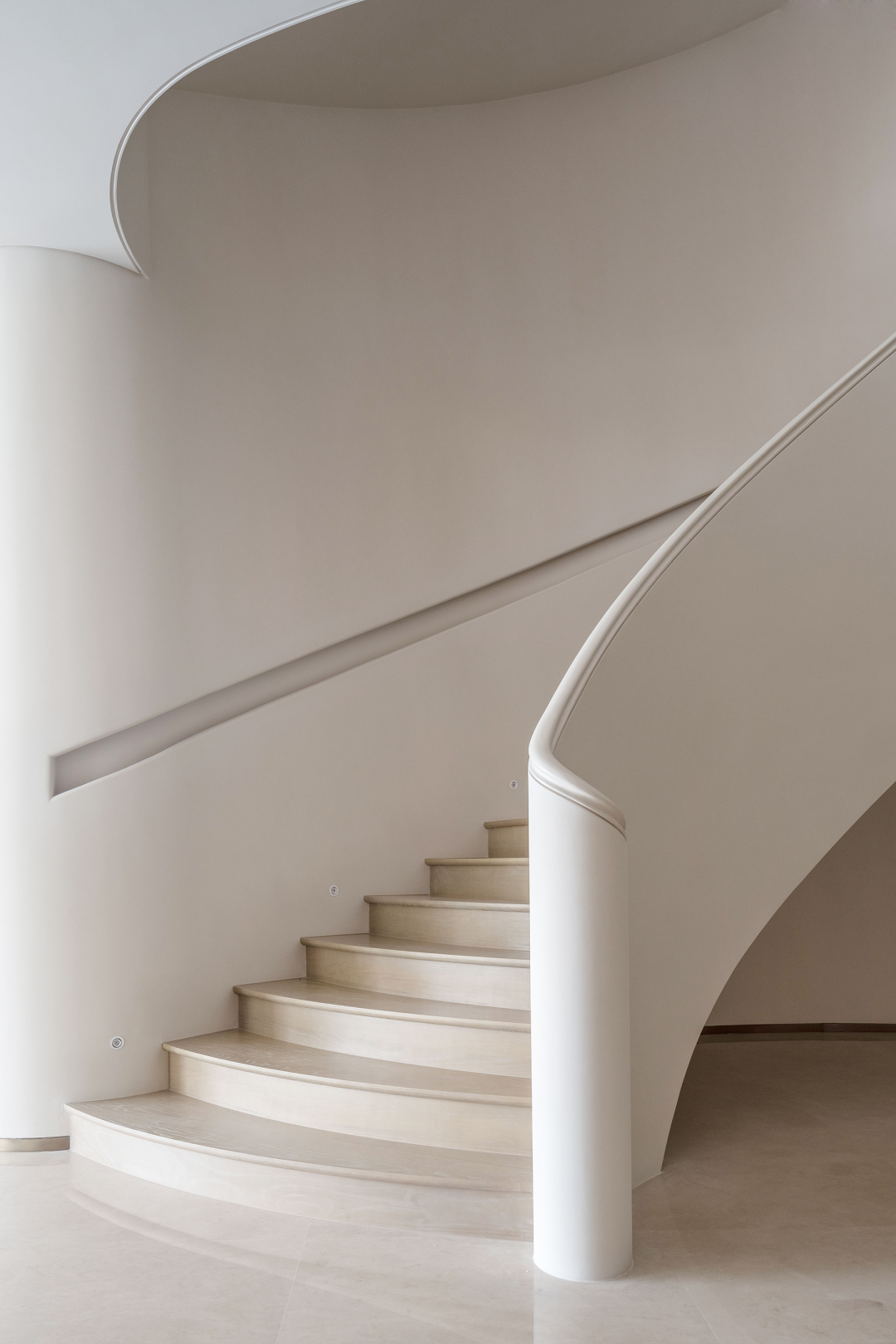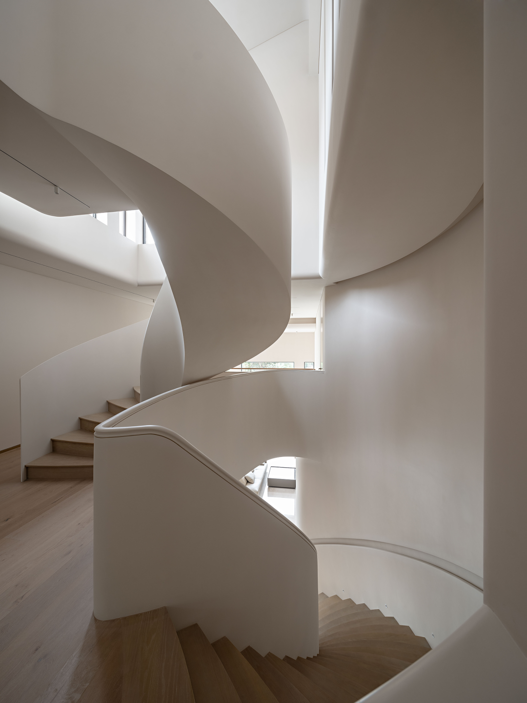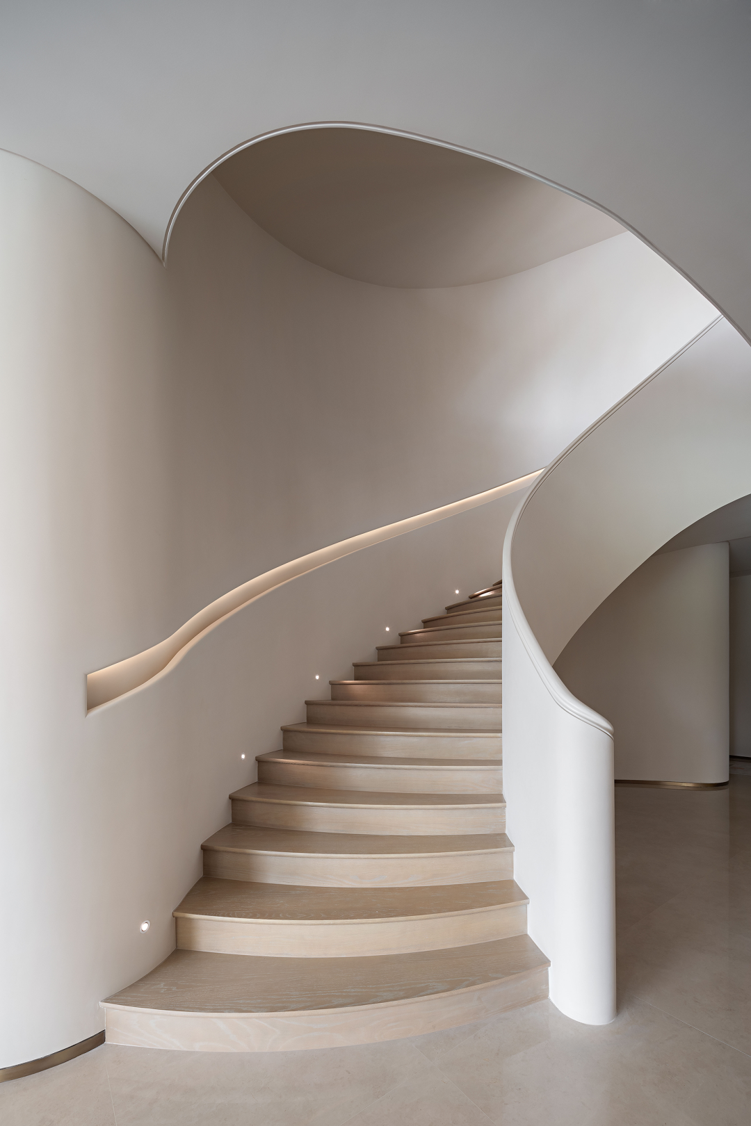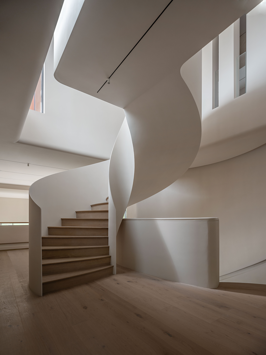 原建筑的弧形楼梯在整个空间中尺度其实稍微过大,我们缩小了弧形楼梯的开孔,释放更多的使用空间,也让原本过大的楼梯比例上和整个空间更加协调。二楼到三楼的楼梯是整个空间的一个大胆的尝试,原方案楼梯对二楼和整个竖向交通中心的采光有一定的影响,我们做了一个旋转楼梯,这样可以减少对三楼挑空区的遮挡,旋转楼梯和一楼到二楼的弧形楼梯交叠在一起无意中产生雕塑般的空间效果。