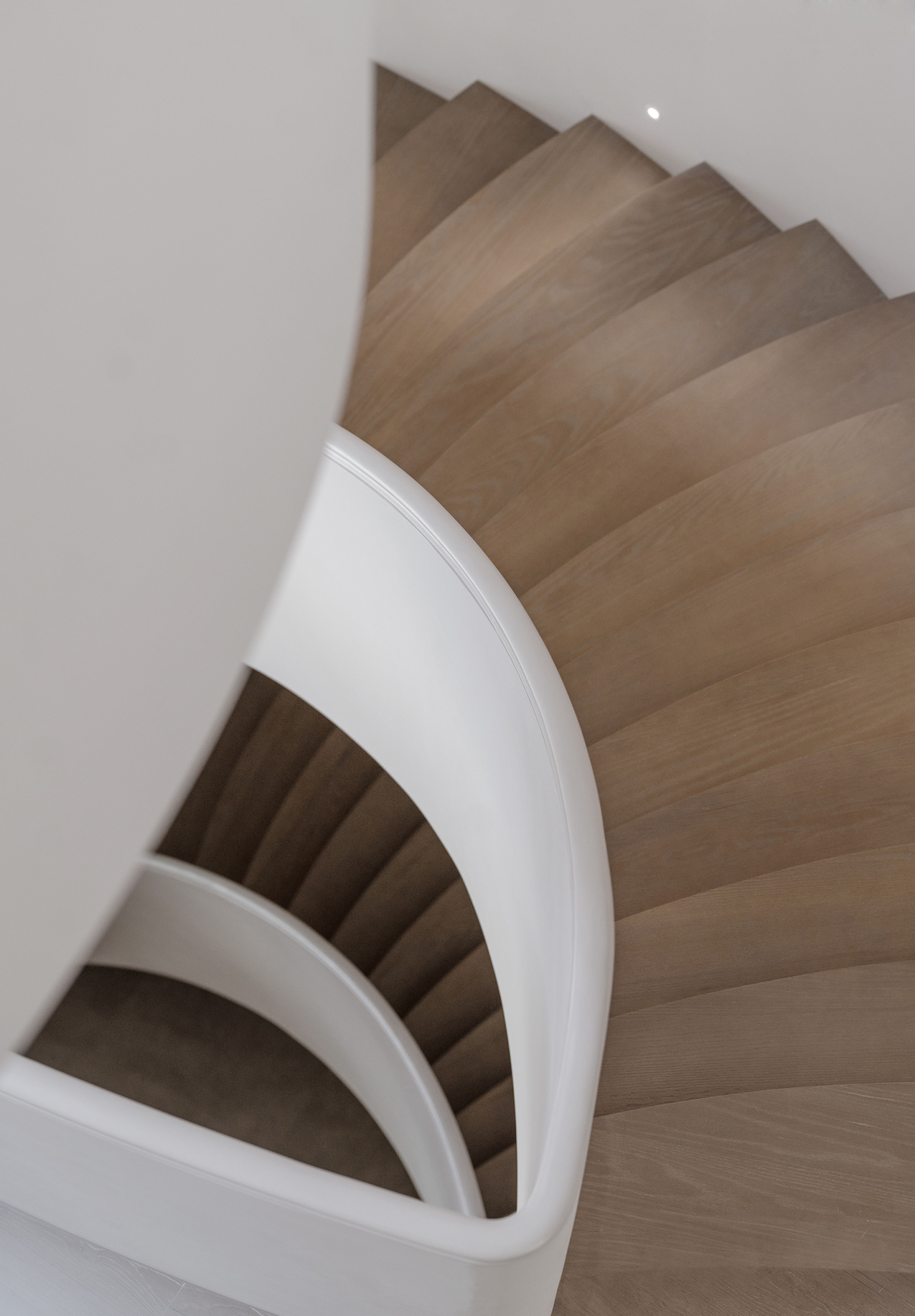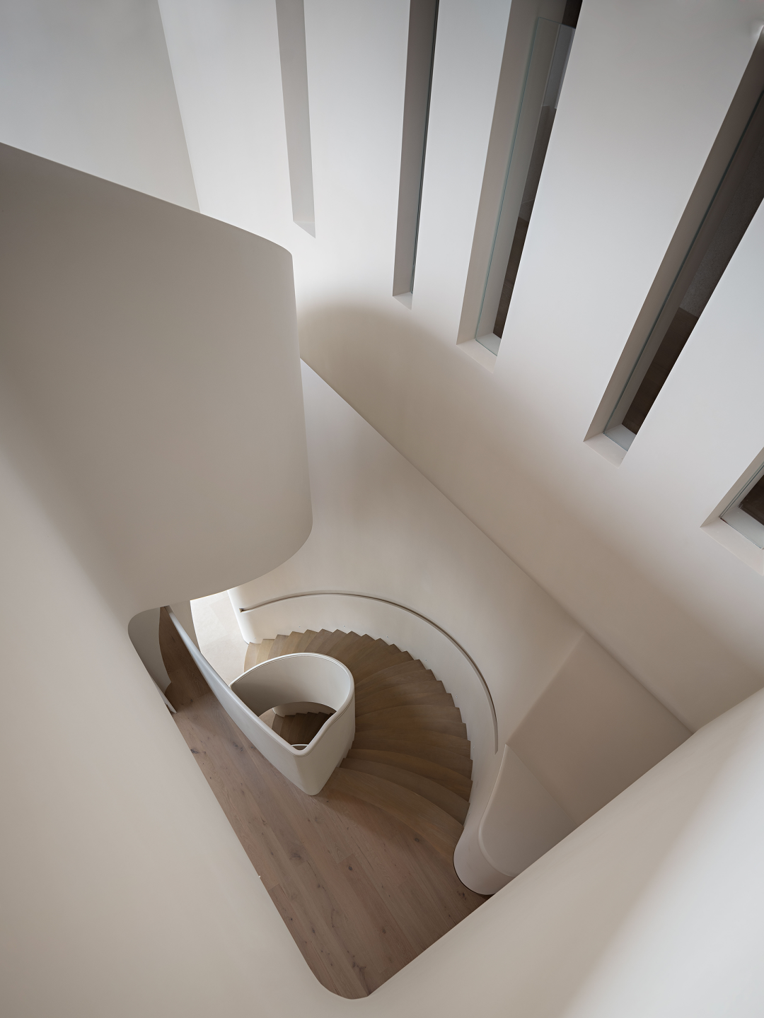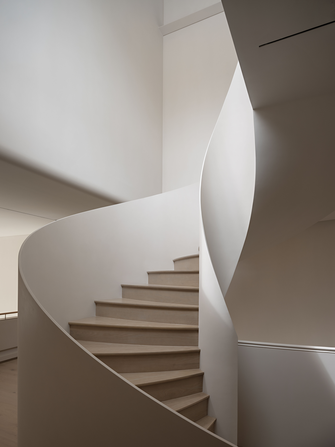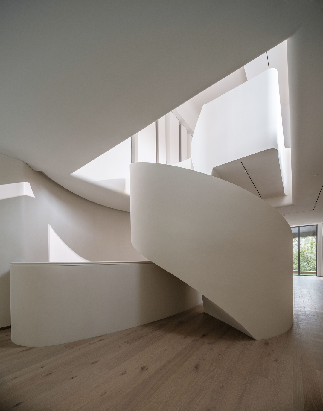 原建筑的弧形楼梯在整个空间中尺度其实稍微过大,我们缩小了弧形楼梯的开孔,释放更多的使用空间,也让原本过大的楼梯比例上和整个空间更加协调。二楼到三楼的楼梯是整个空间的一个大胆的尝试,原方案楼梯对二楼和整个竖向交通中心的采光有一定的影响,我们做了一个旋转楼梯,这样可以减少对三楼挑空区的遮挡,旋转楼梯和一楼到二楼的弧形楼梯交叠在一起无意中产生雕塑般的空间效果。
