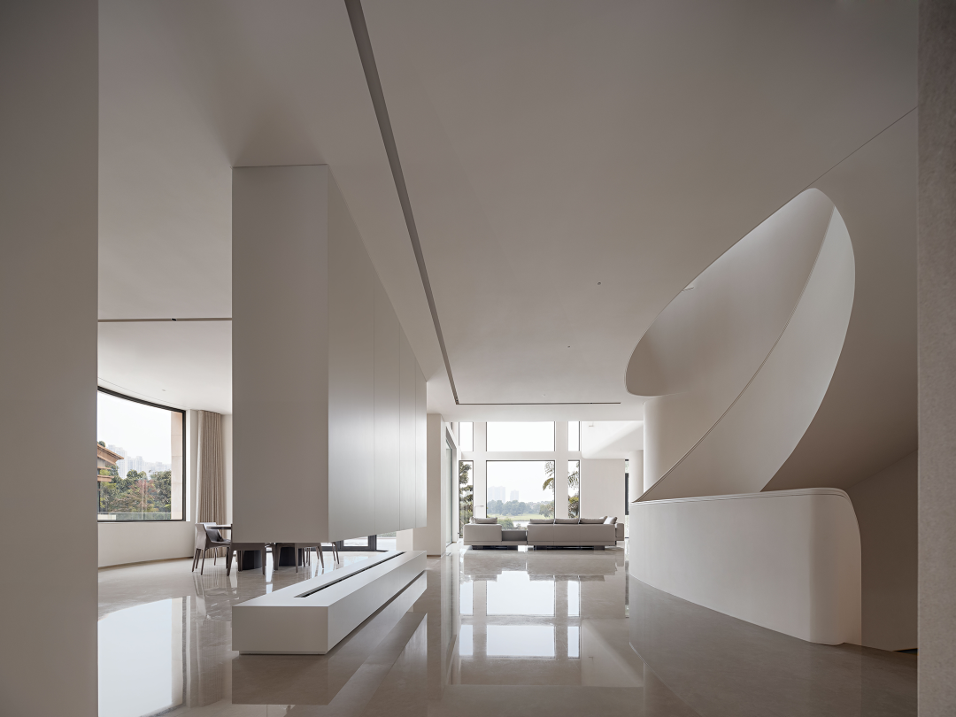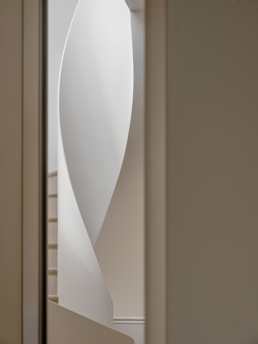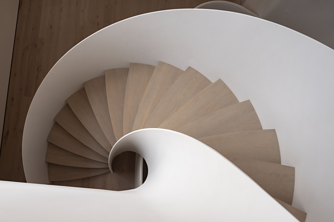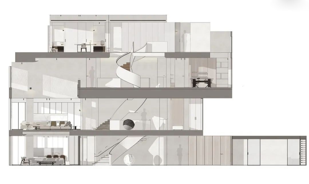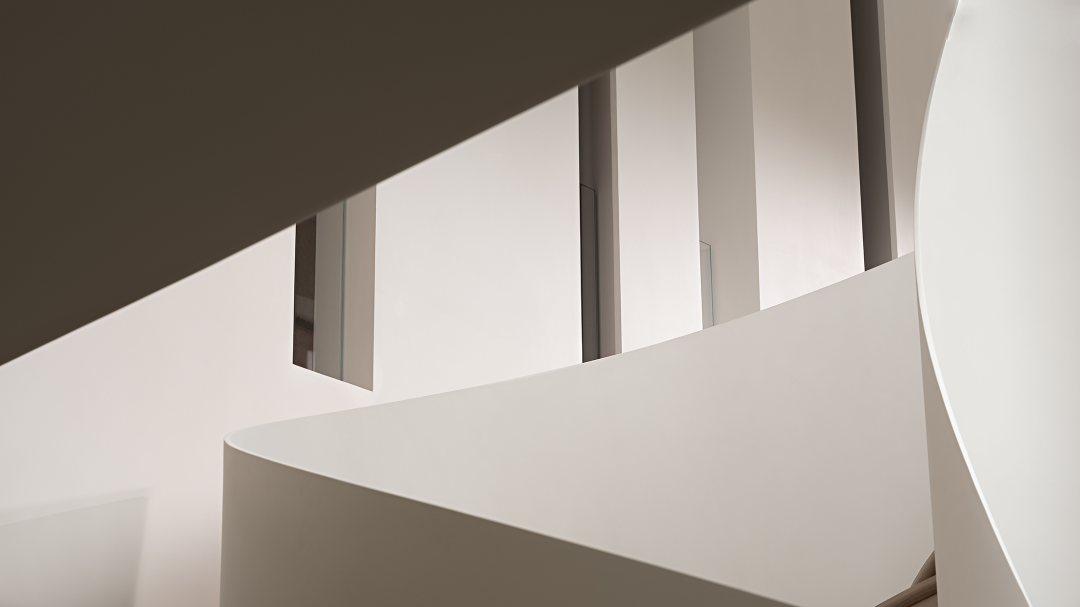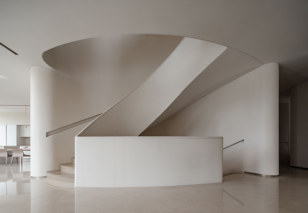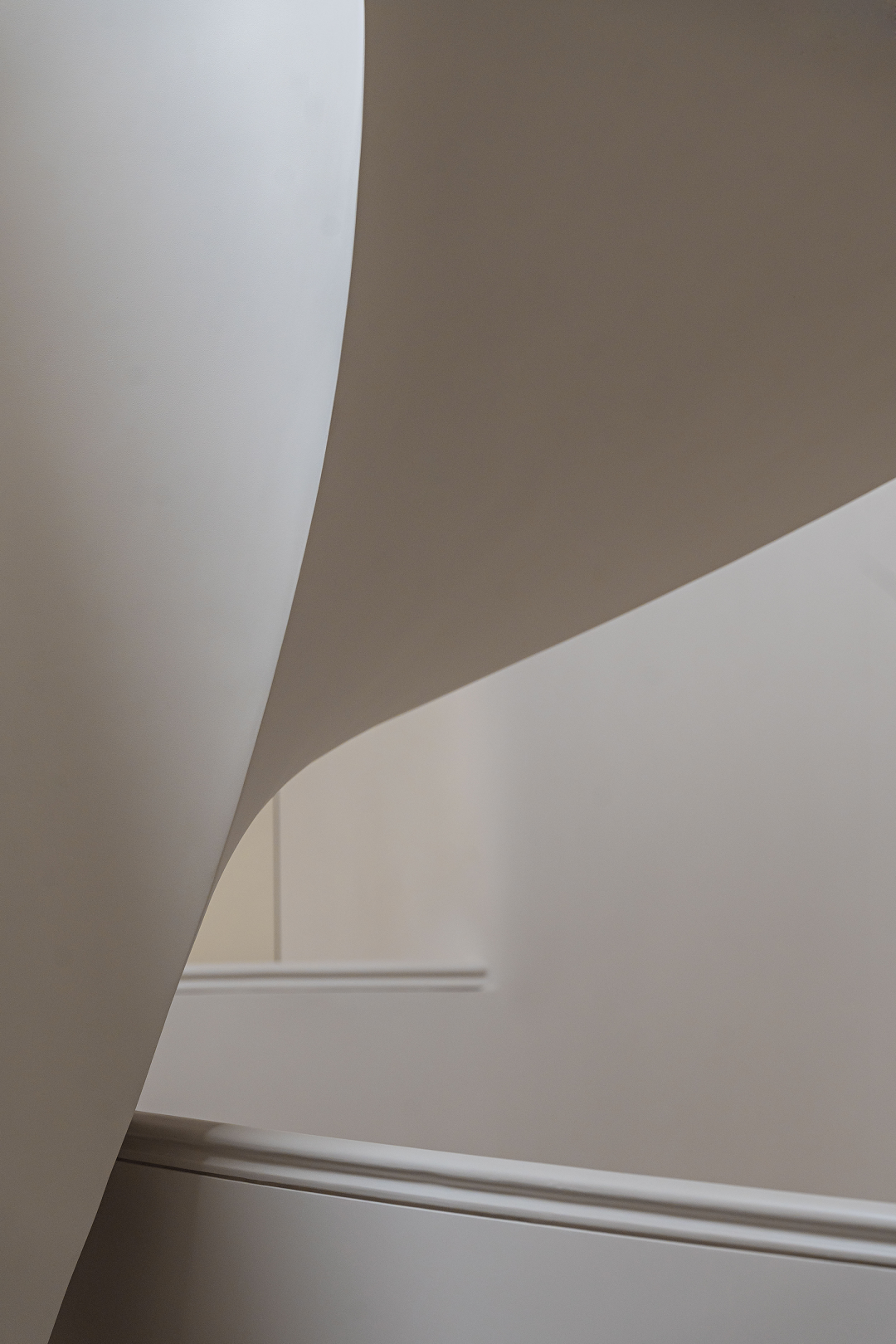 原建筑的弧形楼梯在整个空间中尺度其实稍微过大,我们缩小了弧形楼梯的开孔,释放更多的使用空间,也让原本过大的楼梯比例上和整个空间更加协调。二楼到三楼的楼梯是整个空间的一个大胆的尝试,原方案楼梯对二楼和整个竖向交通中心的采光有一定的影响,我们做了一个旋转楼梯,这样可以减少对三楼挑空区的遮挡,旋转楼梯和一楼到二楼的弧形楼梯交叠在一起无意中产生雕塑般的空间效果。
