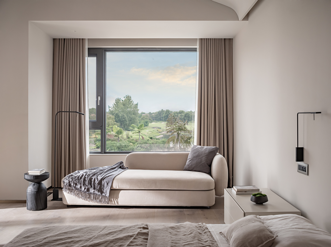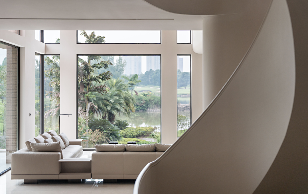 别墅所在地的阴雨天气较多,因此对于室内来说,光线极为重要,在平面处理上业主也希望空间能尽量打开,取消非隐私性的必要窗帘,在这两个问题上与业主有过讨论,在尊重业主的需求下,我们认为空间还是需要适度的秩序感和围合感,因为人与人之间,人与环境之间都有他适度的尺度,脱离了合适的尺度,会缺乏安全感,缺乏空间给人的情感传递。最终和业主达成了一个平衡。